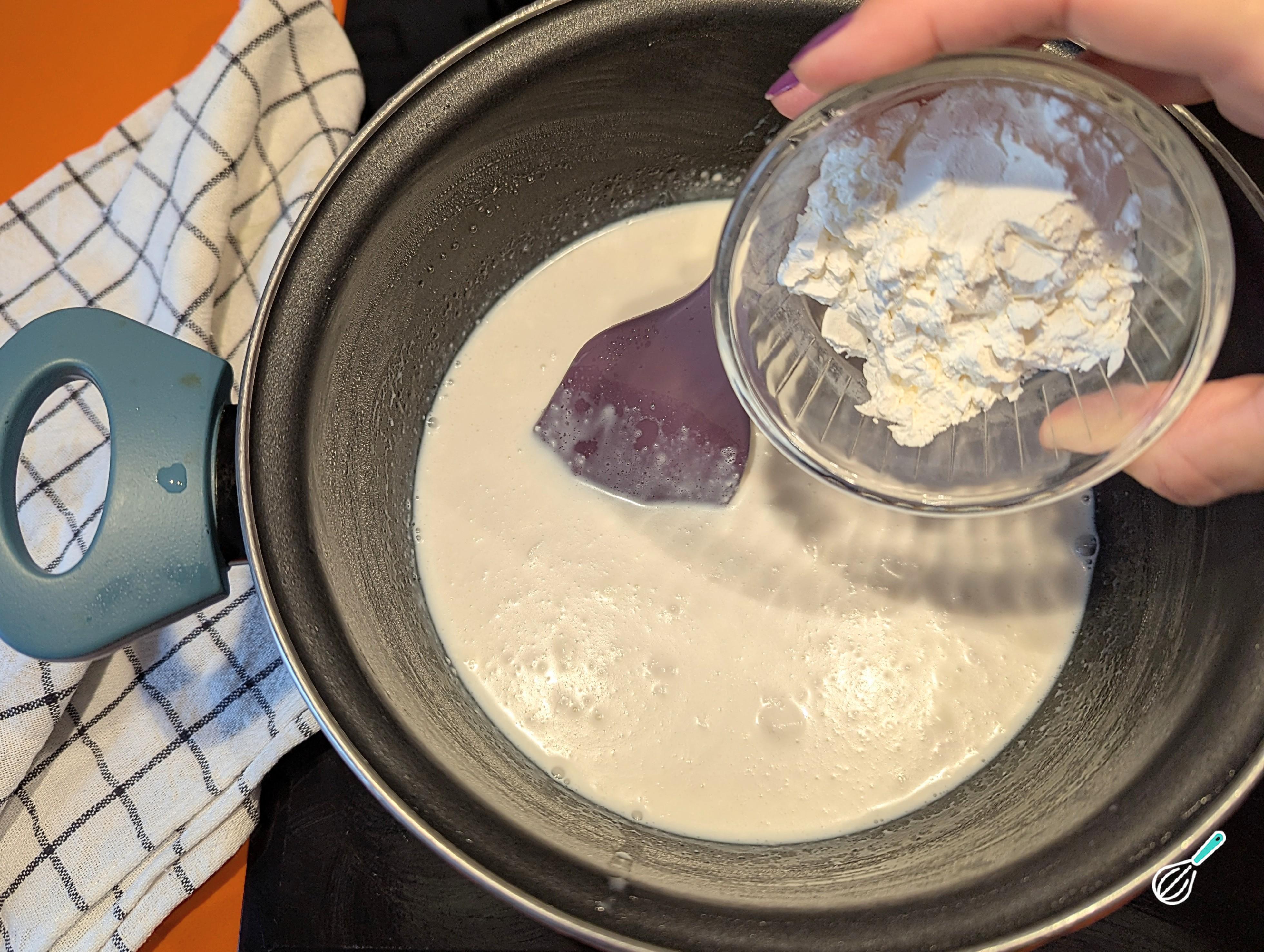 Em outra panela, coloque o leite condensado, o leite, o leite de coco (ou creme de leite) e o amido de milho. Misture bem ainda com o fogo desligado para dissolver o amido e evitar que forme grumos. Ligue o fogo baixo e mexa sempre até o creme engrossar. Quando atingir uma consistência cremosa e lisa, desligue o fogo.