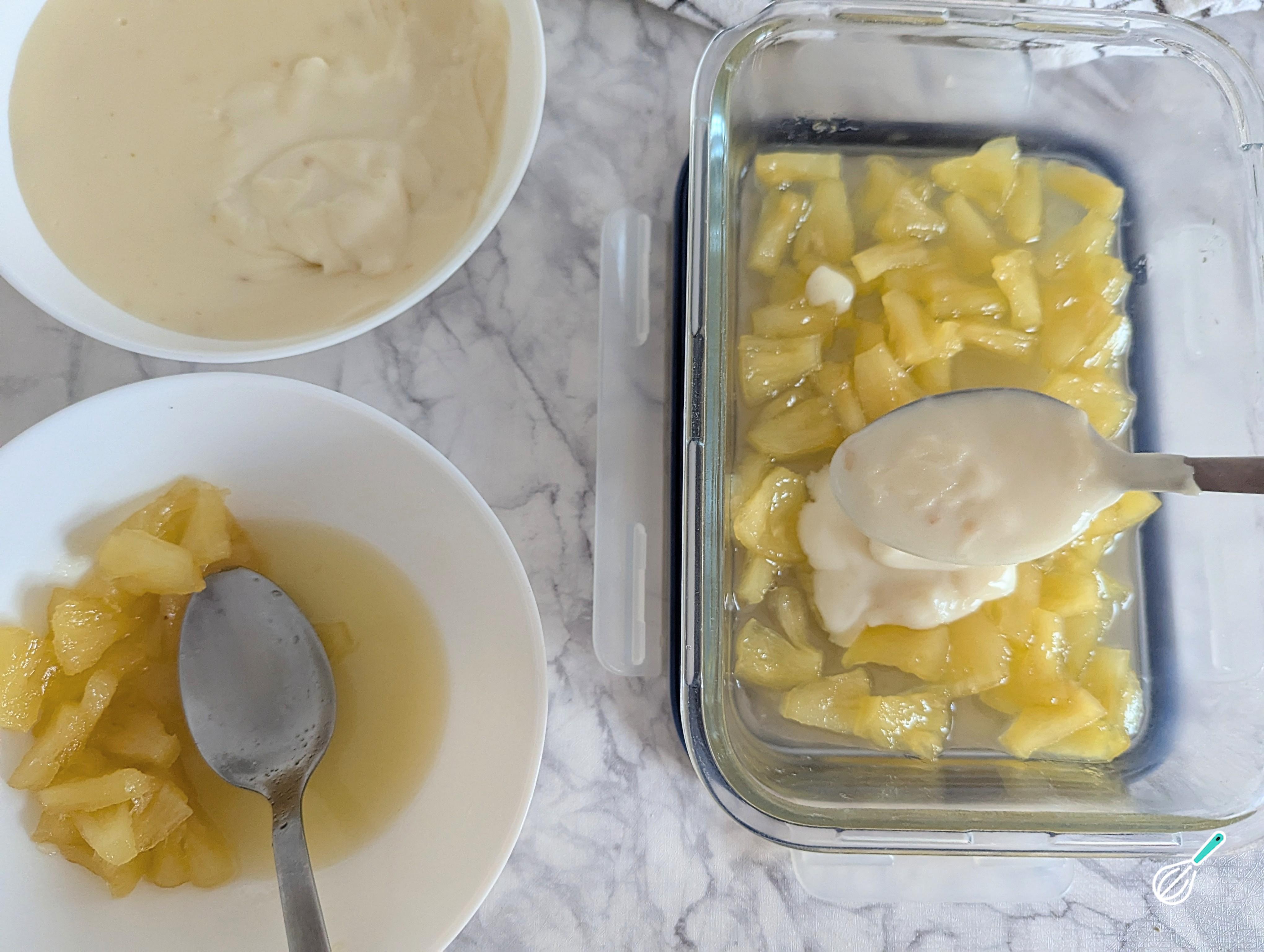 Você pode montar o doce em uma travessa única ou em taças individuais. Comece colocando o abacaxi cozido no fundo e, por cima, adicione o creme. Finalize colocando pedaços de abacaxi para decorar por cima. Leve à geladeira por pelo menos 2 horas antes de servir. Isso ajuda o doce a firmar e ficar ainda mais saboroso.