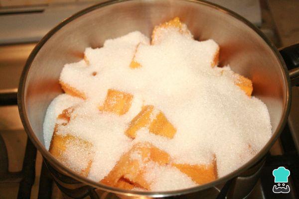 O primeiro passo para confeccionar esta receita de doce de abóbora com coco é colocar em uma panela a abóbora cortada e água. Deixe cozinhar em fogo baixo.