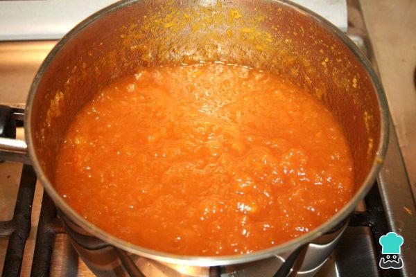 Quando a abóbora estiver cozida, esmague um pouco com um garfo e adicione a canela, o cravo-da-índia, a noz moscada, o açúcar e deixe cozinhar em fogo baixo.