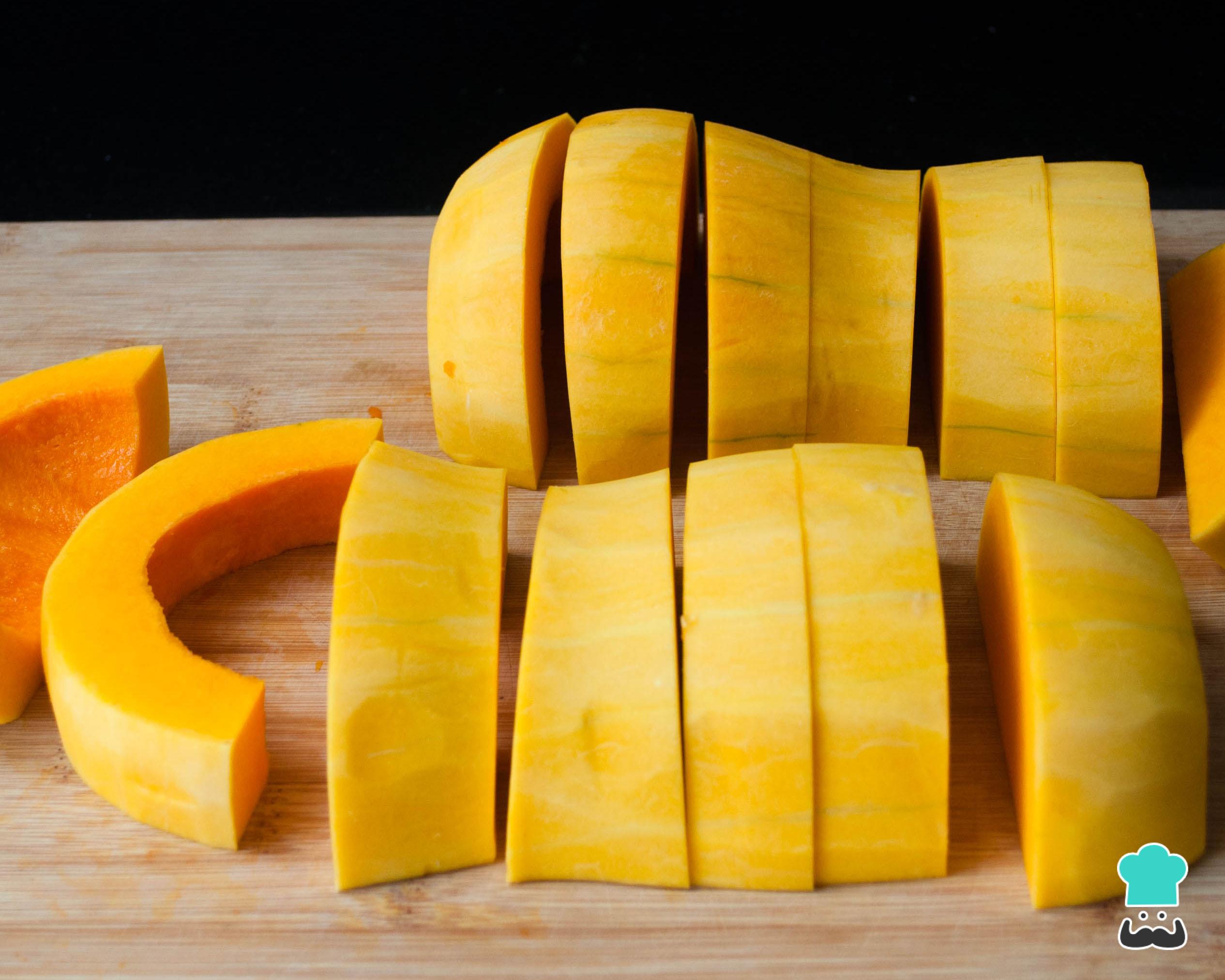 Comece por descascar a abóbora e retirar as sementes. Depois corte em fatias com cerca de 2 dedos de espessura e pique em pedaços pequenos.