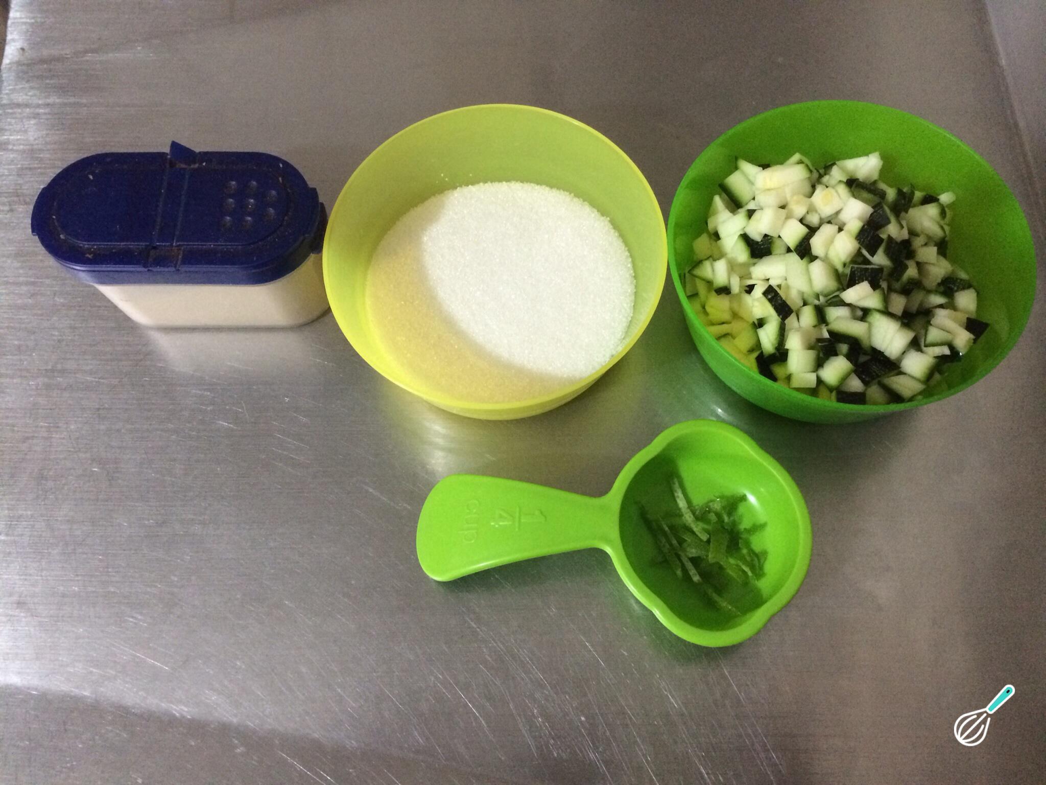 Antes de fazer esta receita de doce de abobrinha, o primeiro passo é reunir todos os ingredientes.