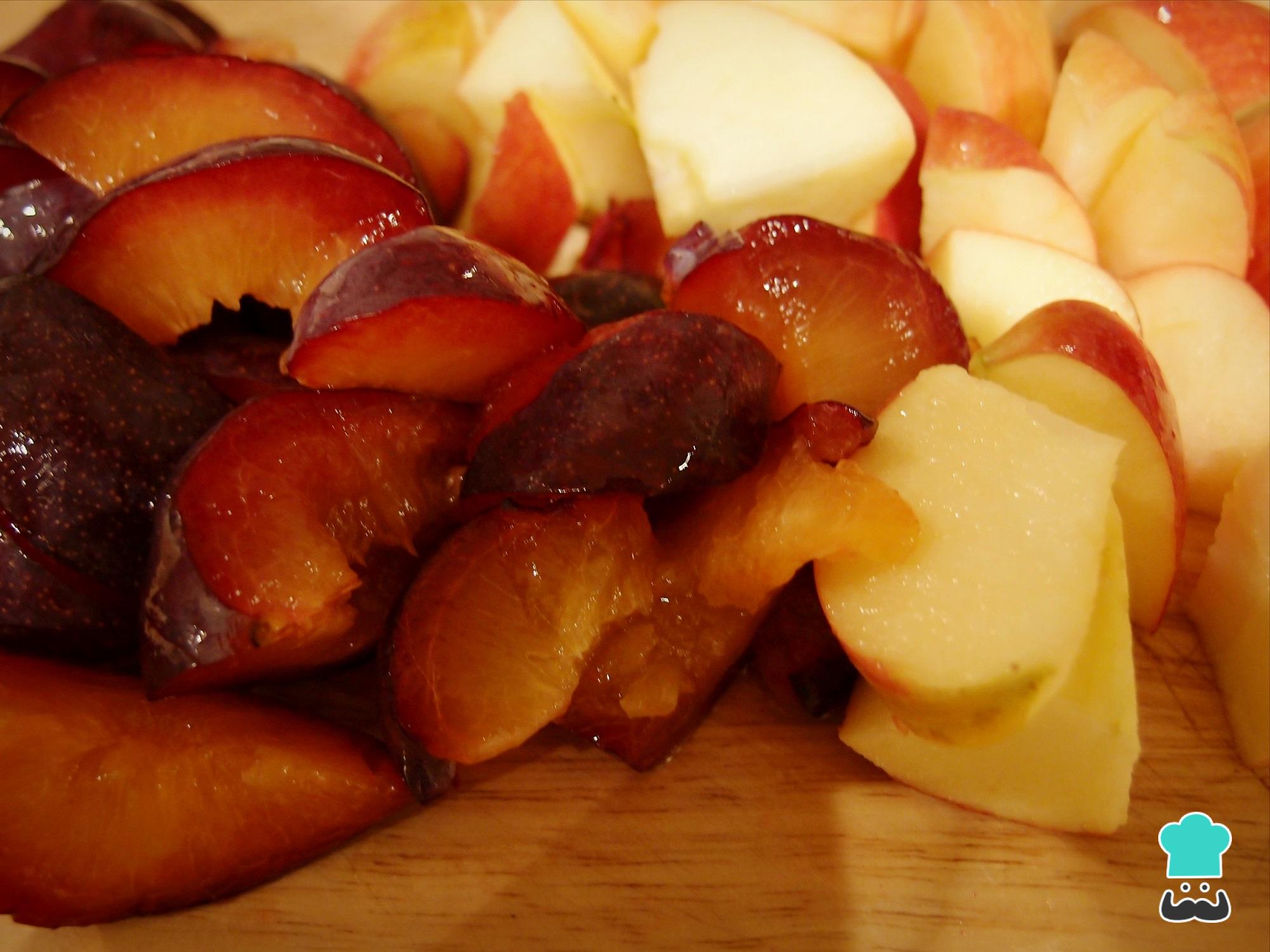 O primeiro passo para fazer esta geleia caseira é retirar o caroço das ameixas e das maçãs, cortar as frutas em pedaços e colocar numa panela.