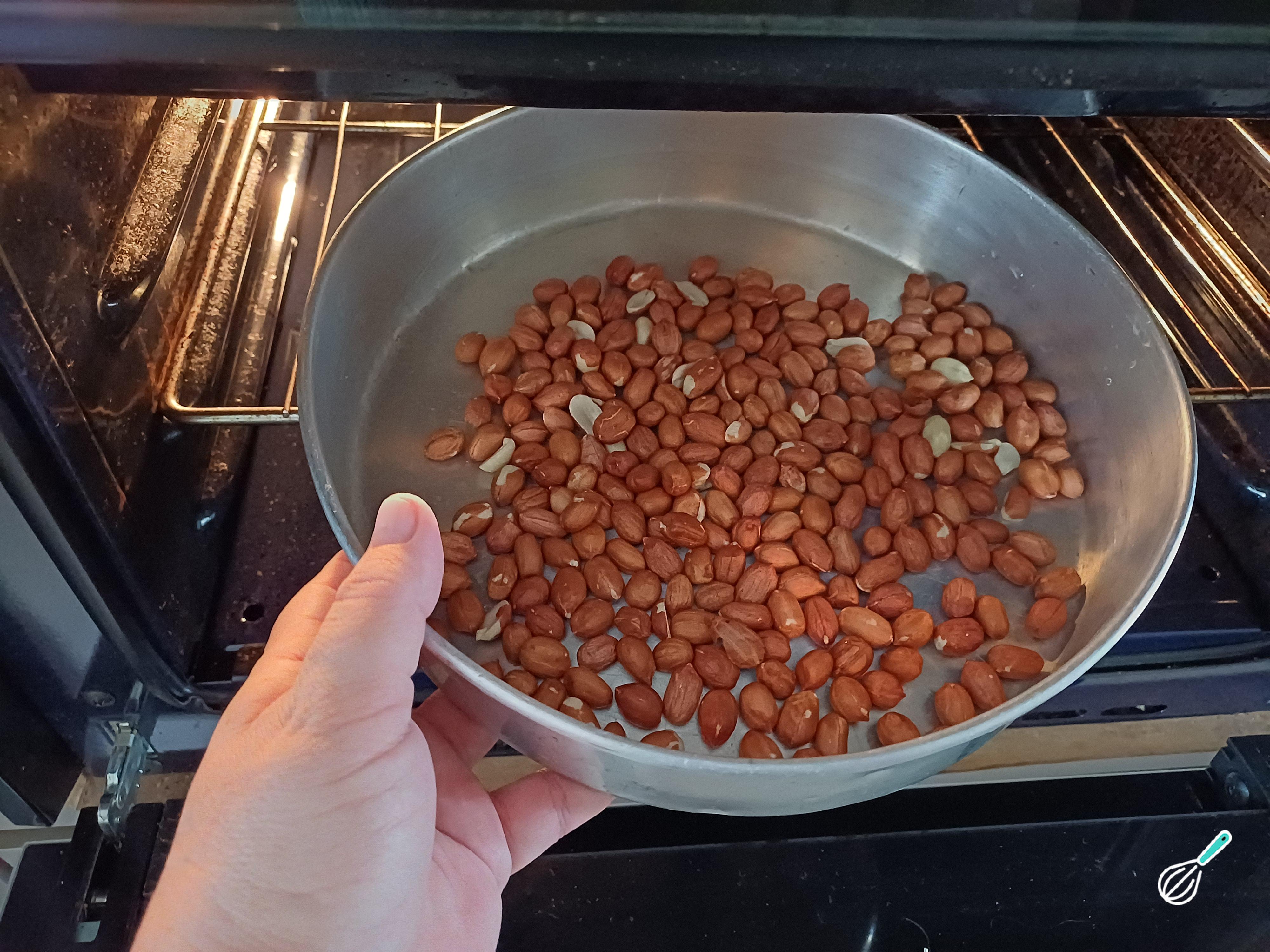 Caso o amendoim ainda tenha pele, leve-o ao forno por alguns minutos até que a pele comece a se soltar. Em seguida, esfregue os grãos com um pano limpo para retirar toda a pele.