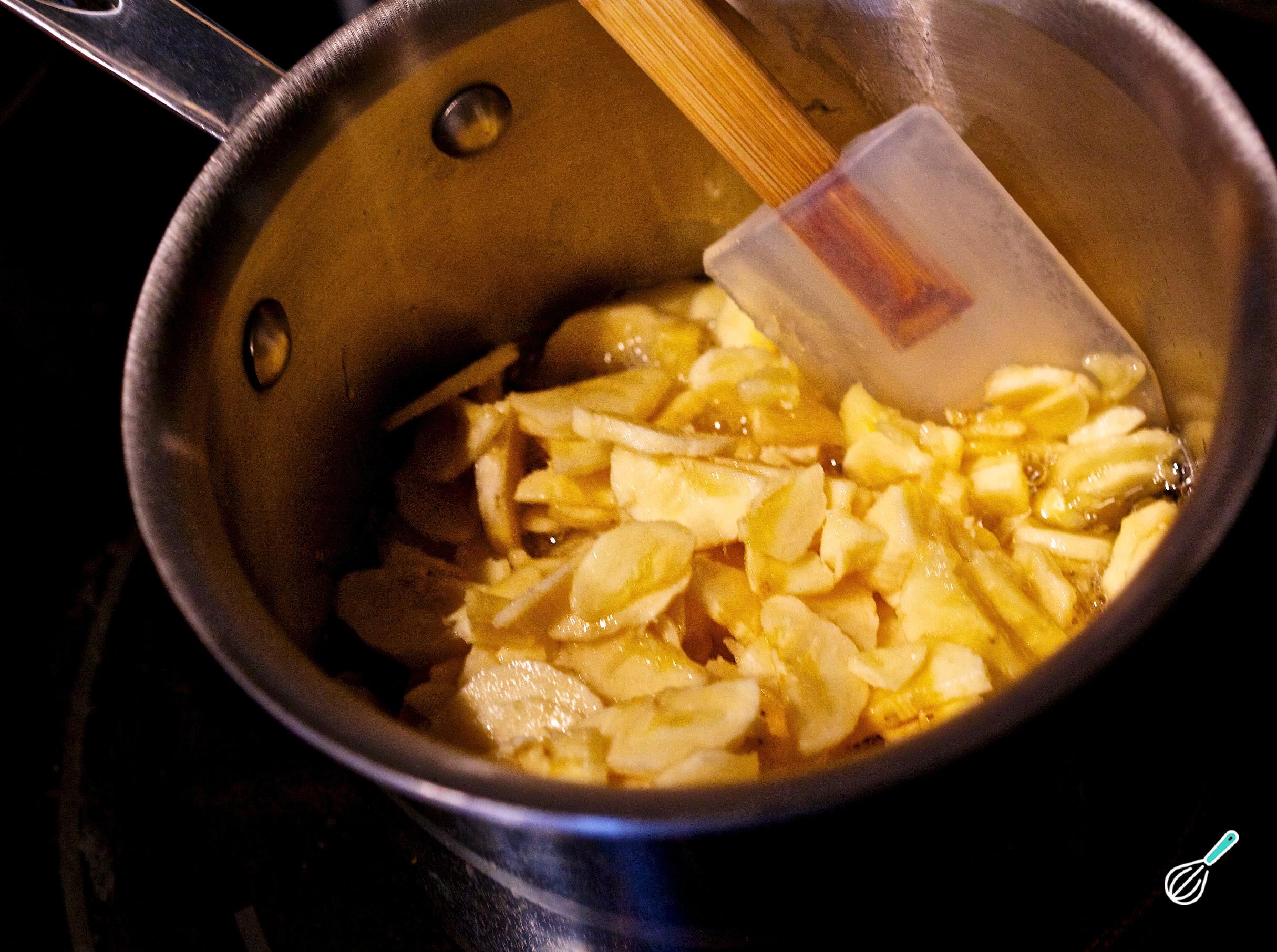 Coloque as bananas em uma panela junto com o açúcar, leve ao fogo médio e fique mexendo por 10 minutos, para soltar a água.