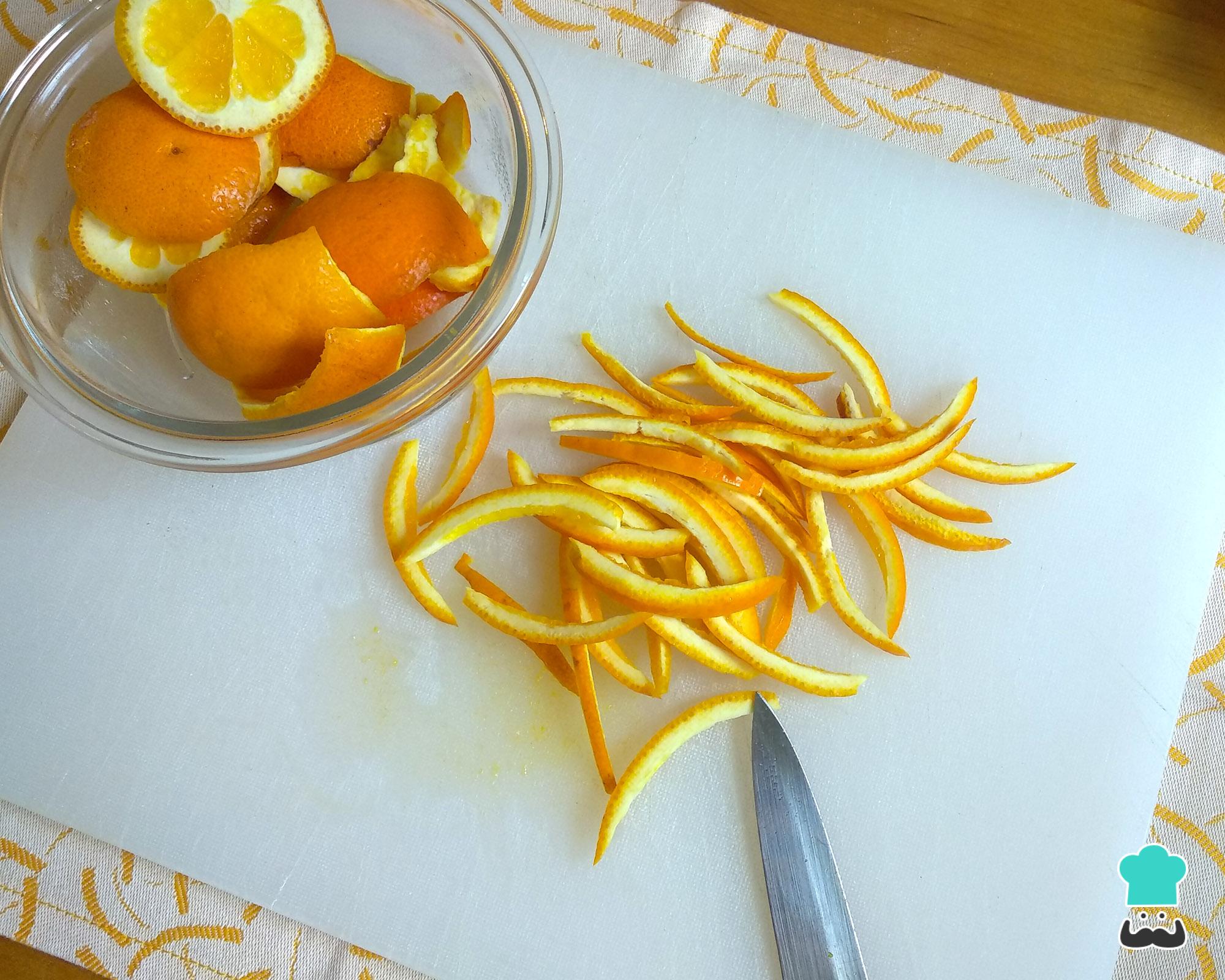 Lave bem as cascas de laranja e corte-as em tirinhas com mais ou menos o mesmo tamanho.