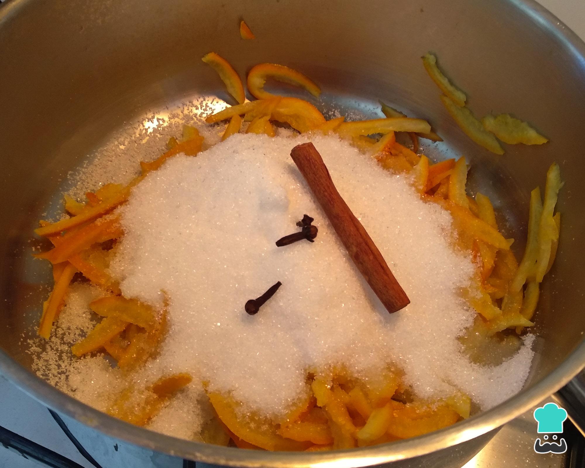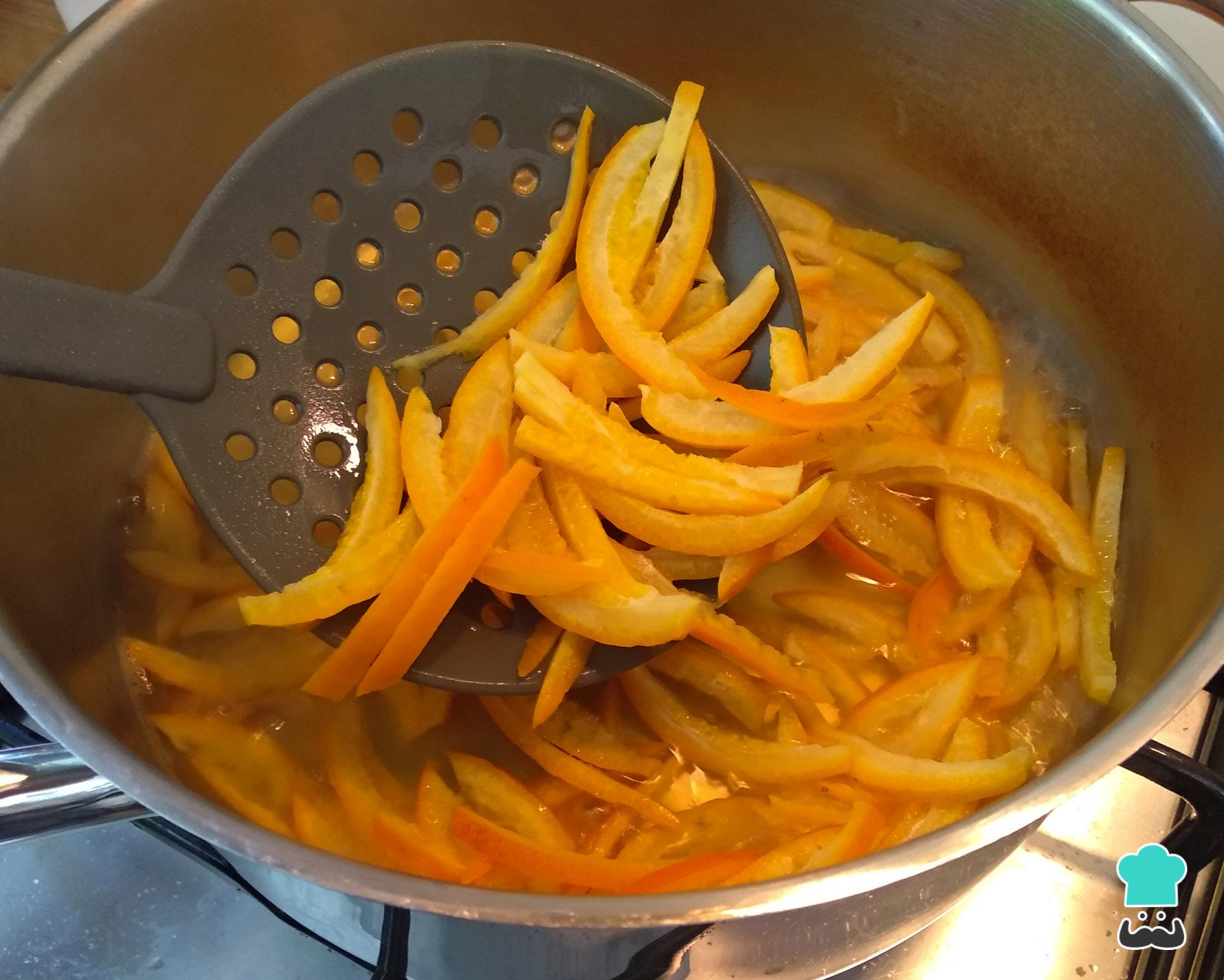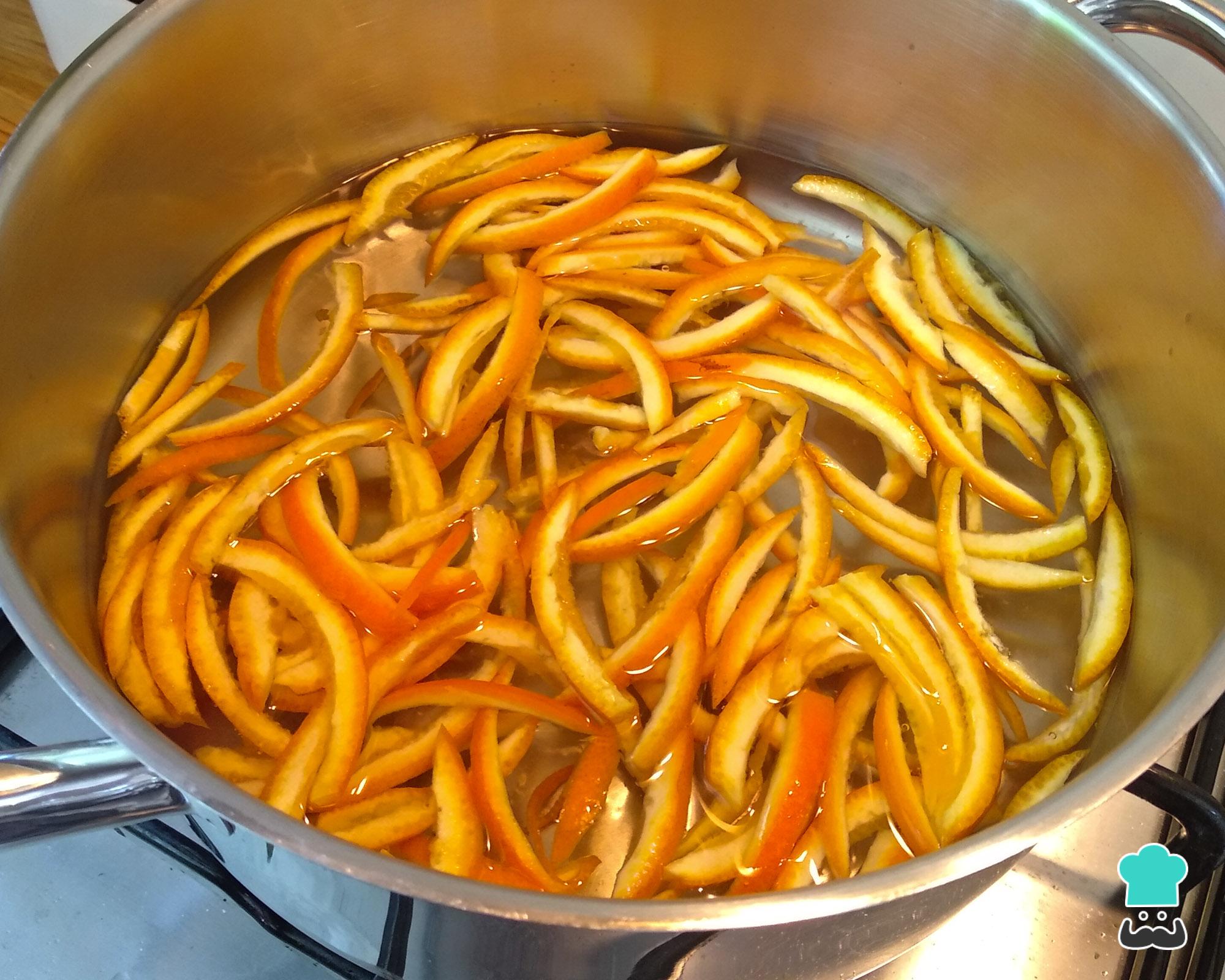 Como tirar amargo da casca de laranja? Coloque as tirinhas de casca de laranja numa panela, cubra com água filtrada e leve ao fogo médio. Deixe ferver por 1-2 minutos e escorra.