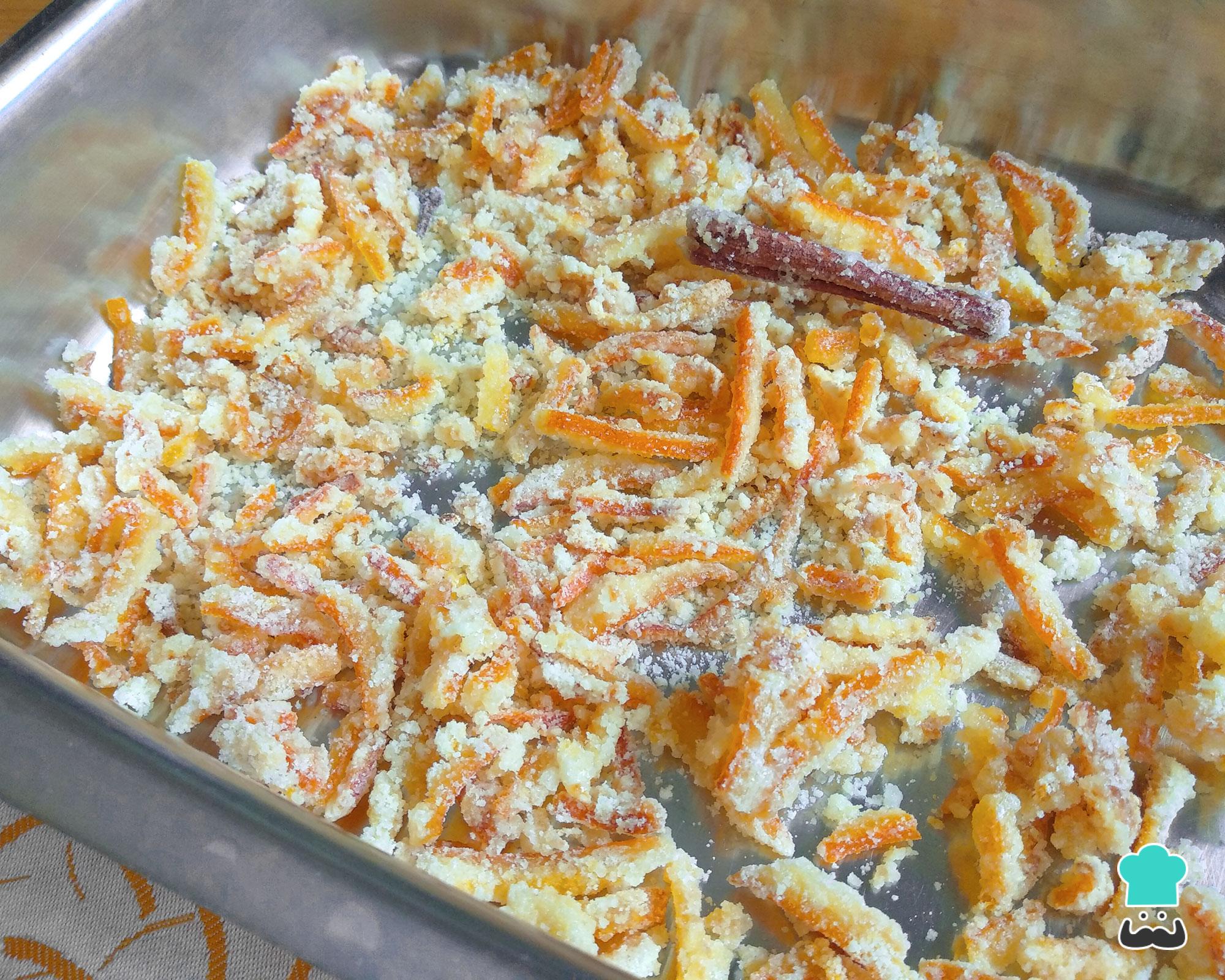 Dica: as cascas de laranja podem ser aproveitadas depois do preparo de, por exemplo, um suco de laranja natural ou bolo de laranja sem casca. Esta receita também pode ser preparada igualmente com casca de limão!