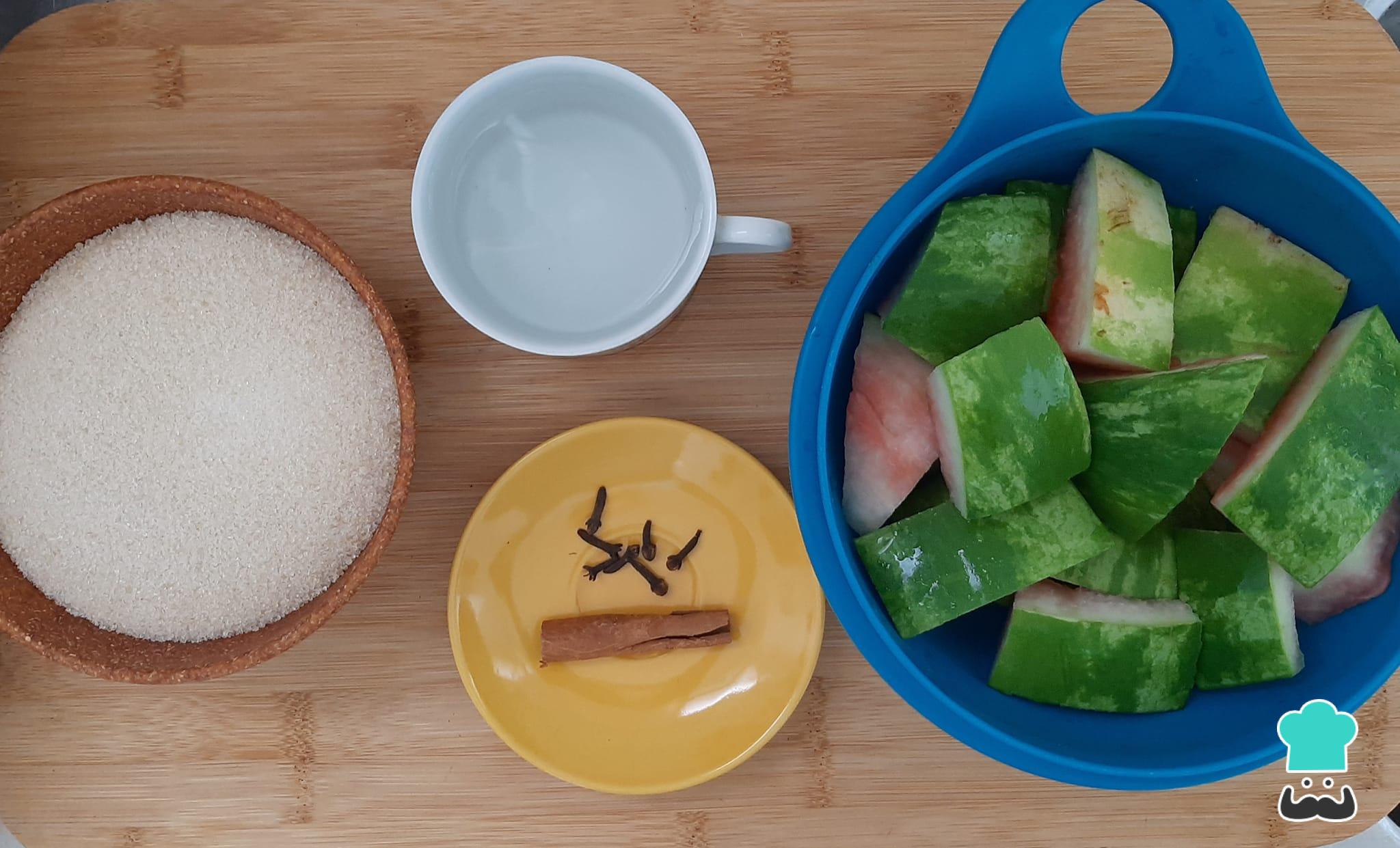 Separe os ingredientes necessários para preparar a receita de doce de casca de melancia.