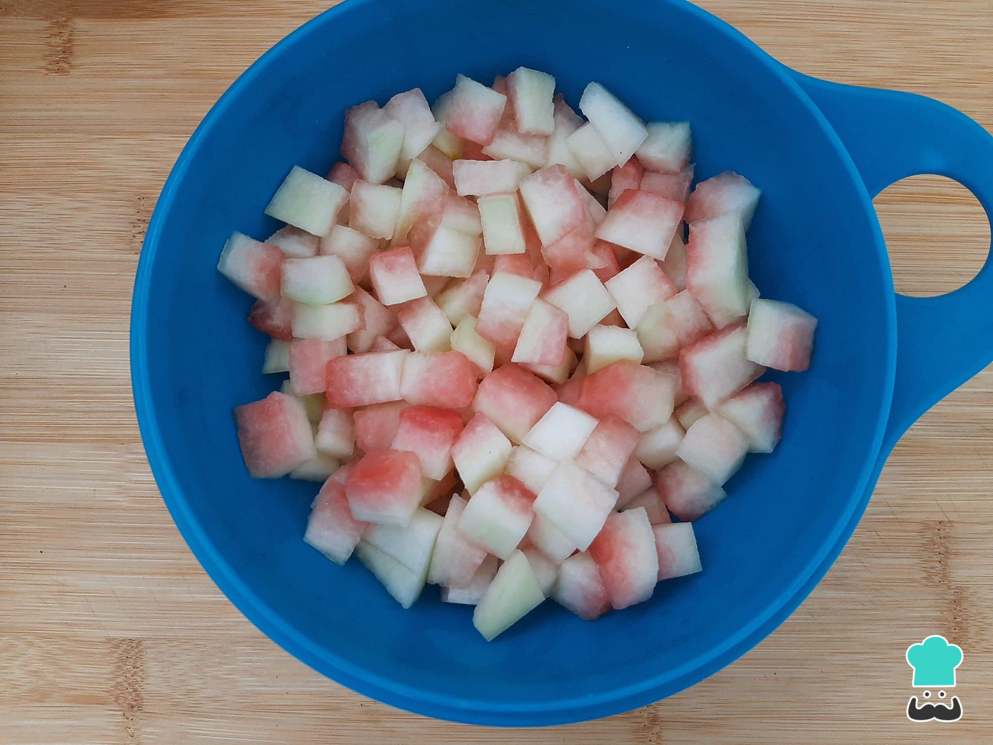 Retire a parte verde da casca da melancia e, em seguida, corte a parte branca em cubinhos.