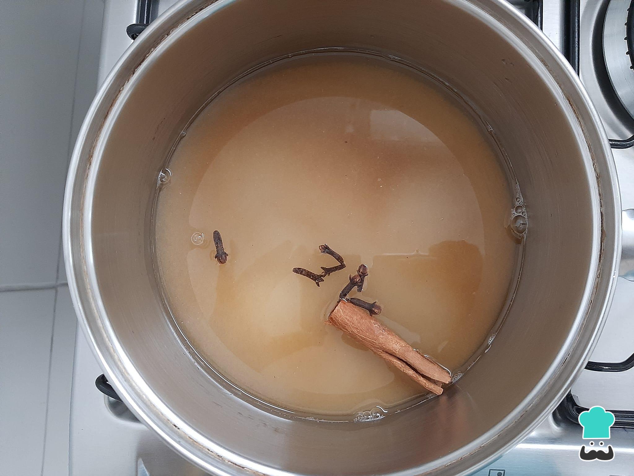 Numa panela média, junte o açúcar com a água, os cravos da índia e a canela em pau, misturando rapidamente.