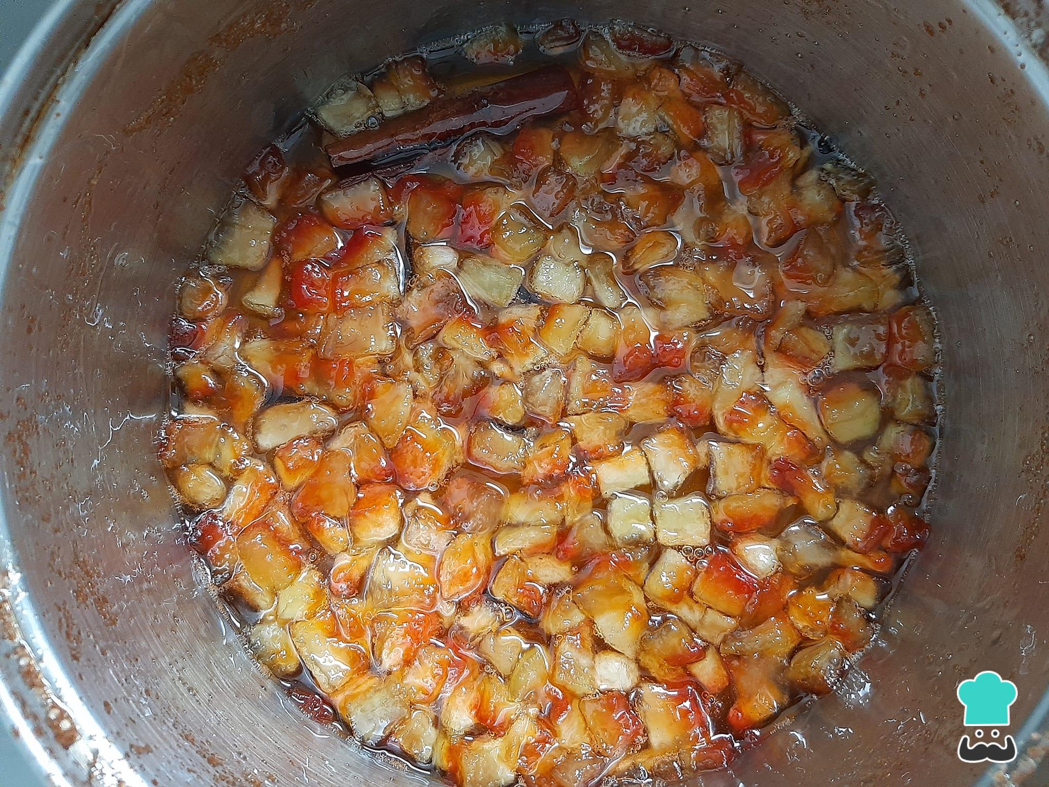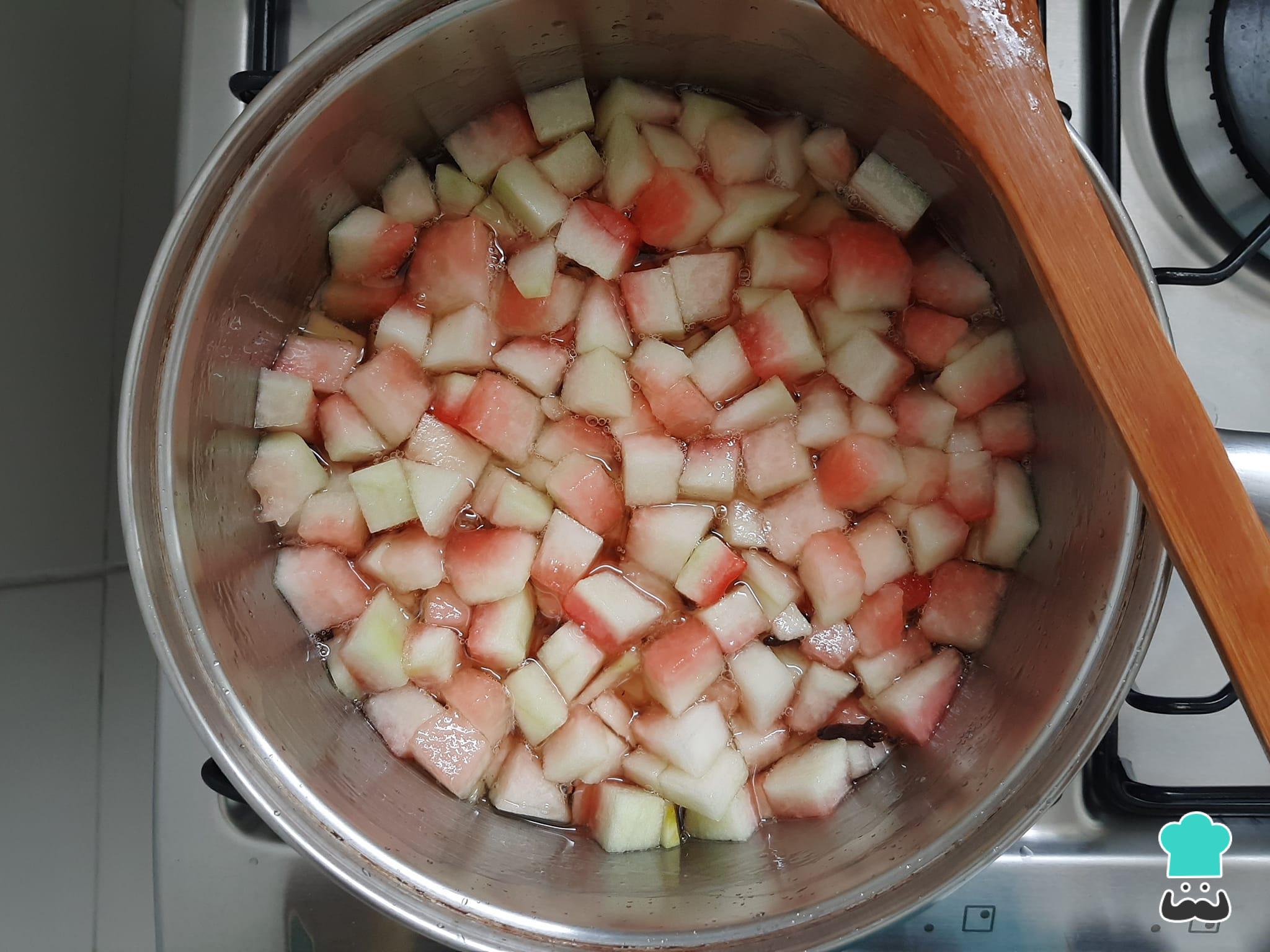 Nesse momento, adicione a casca de melancia em cubinhos na panela e misture bem. Deixe cozinhar este doce de melancia caseiro por aproximadamente 40 minutos em fogo baixo, mexendo de vez em quando.