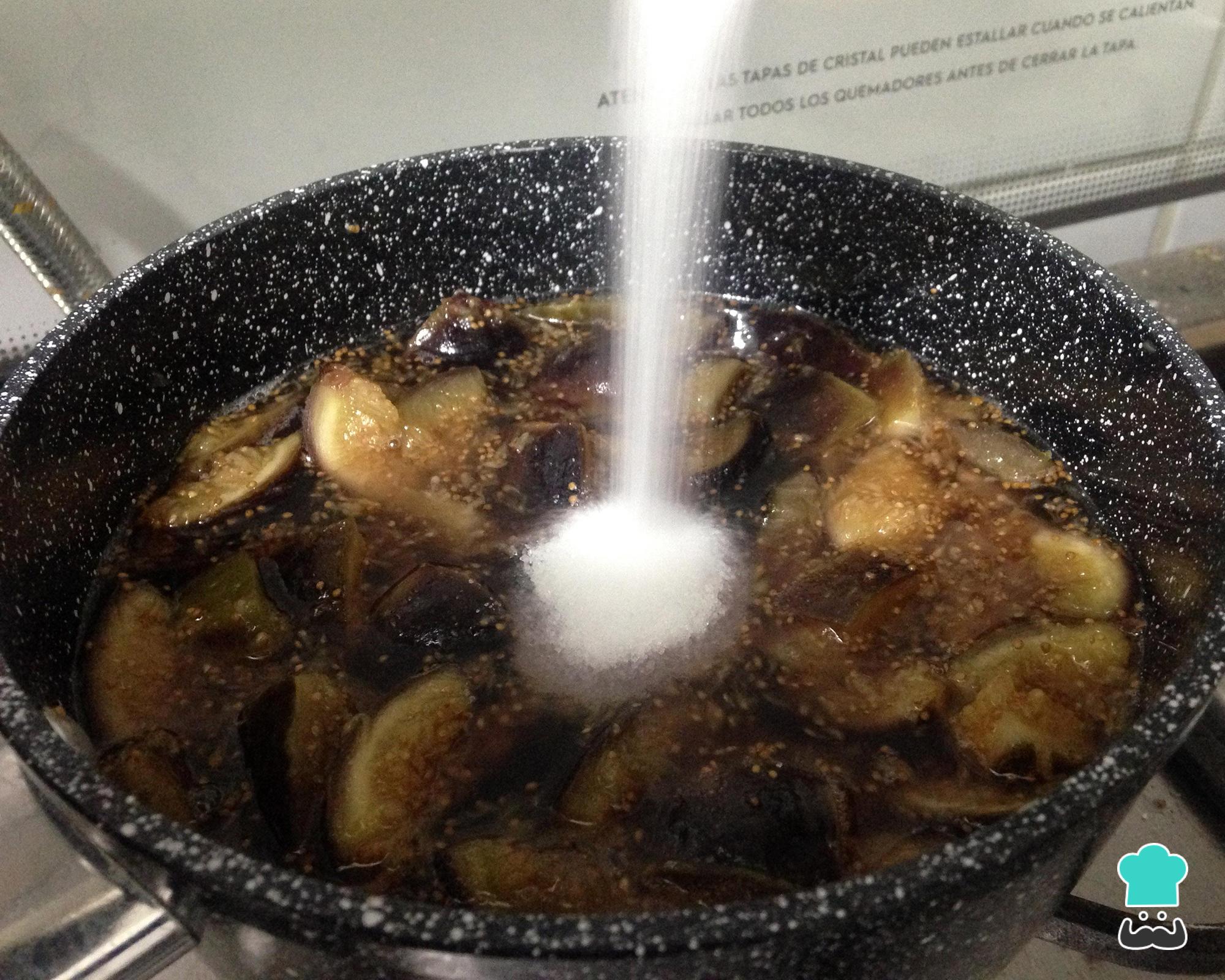 Depois de ferver, adicione o açúcar e o suco de limão e misture. Baixe para o fogo médio-baixo e deixe cozinhar por 40-60 minutos, mexendo de vez em quando, para a mistura do doce de figo não grudar no fundo da panela.