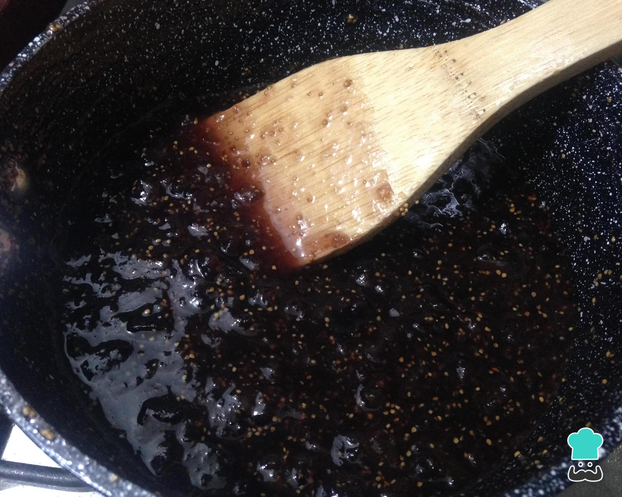 A consistência do doce de figo para passar no pão depende do seu gosto. Você pode deixar os pedacinhos de figo inteiros ou esmagá-los com a colher.