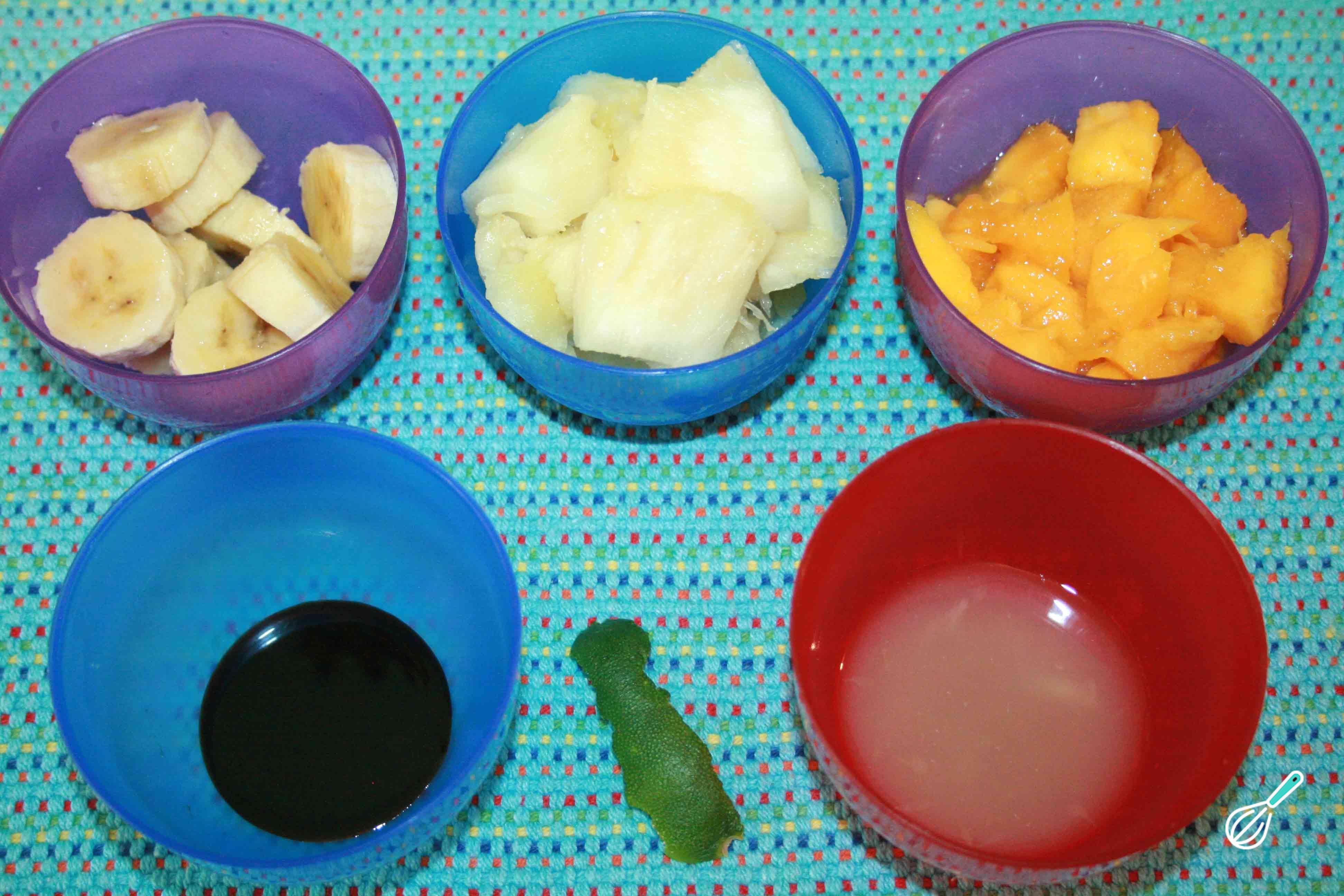 Comece por reunir os ingredientes necessários ao preparo desta receita com frutas saudável. Lave as frutas e corte todas em pedaços. No caso dos limões separe um pouco de raspa de um e esprema o suco do outro.