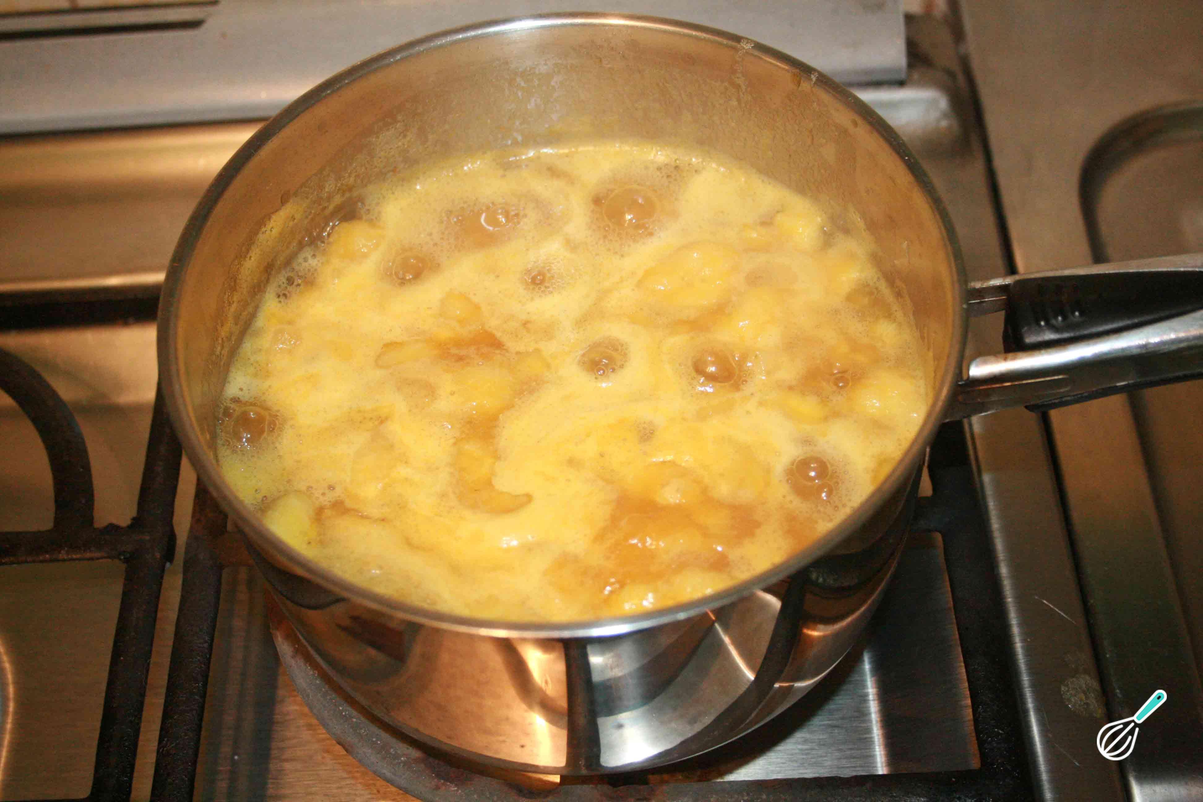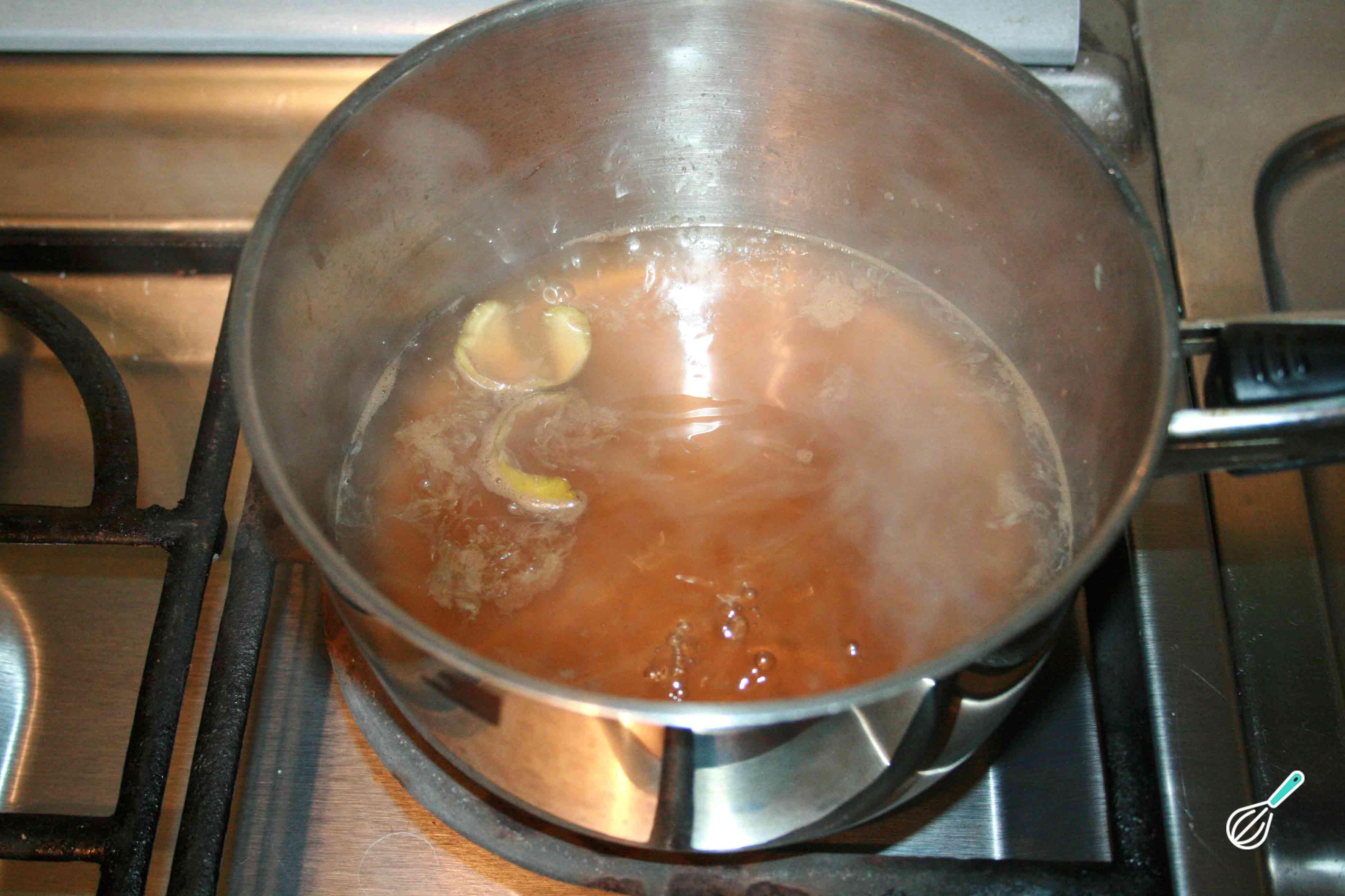Numa panela coloque a essência de baunilha, o suco de limão e a raspa. Cozinhe em fogo alto até ferver.