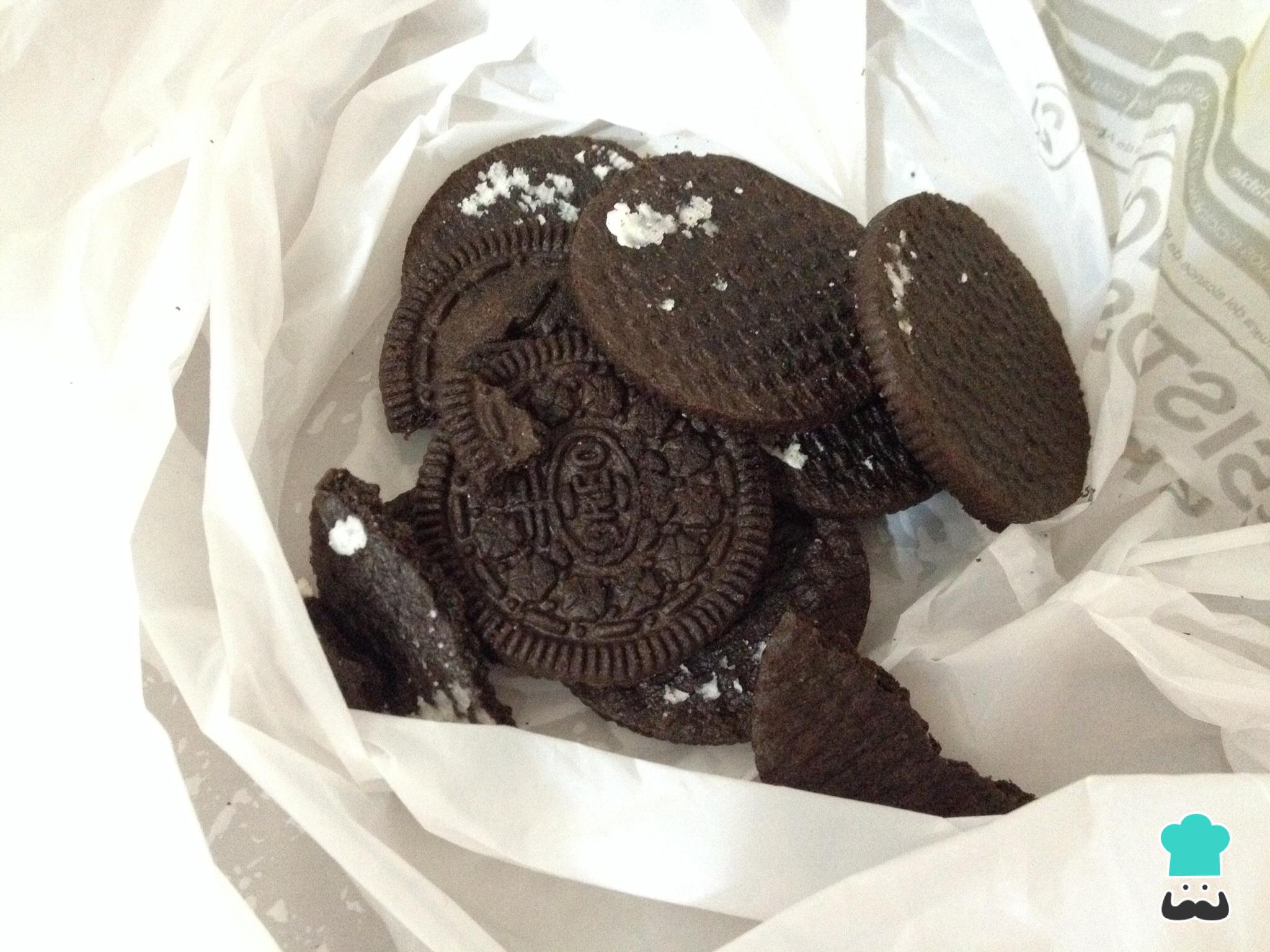 Retire o creme dos biscoitos e reserve. Processe os biscoitos em um processador de cozinha ou coloque em um saco plástico e sove com um rolo de cozinha - muito mais divertido!