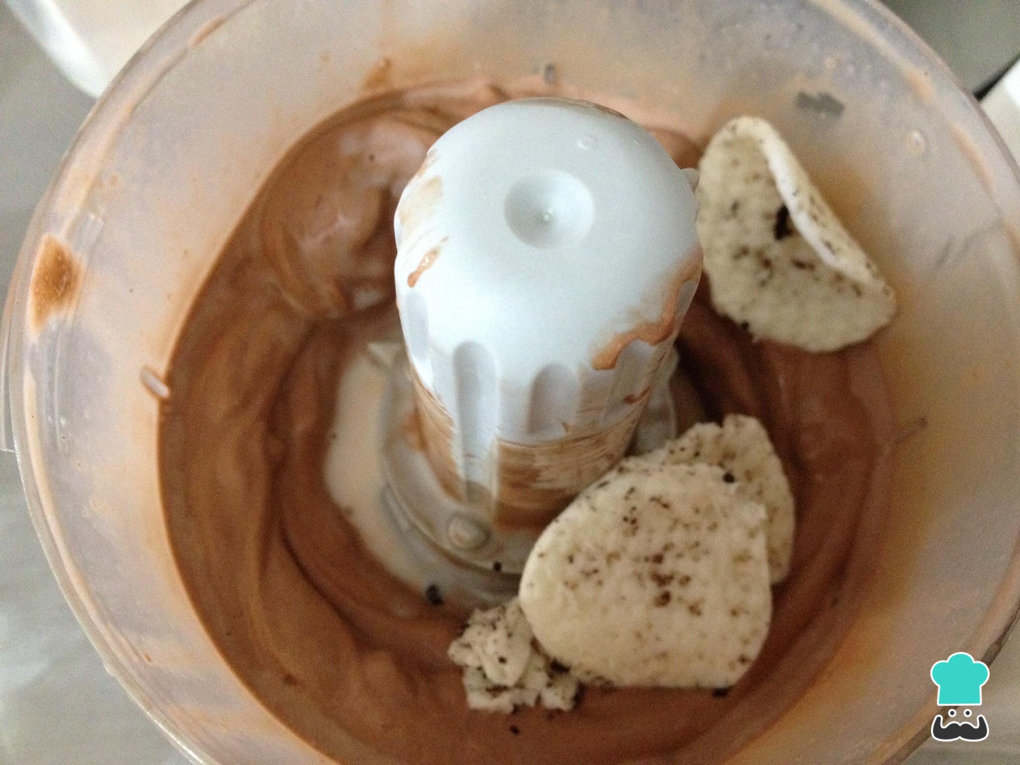 Adicione o extrato de baunilha e o creme dos biscoitos e volte a bater.