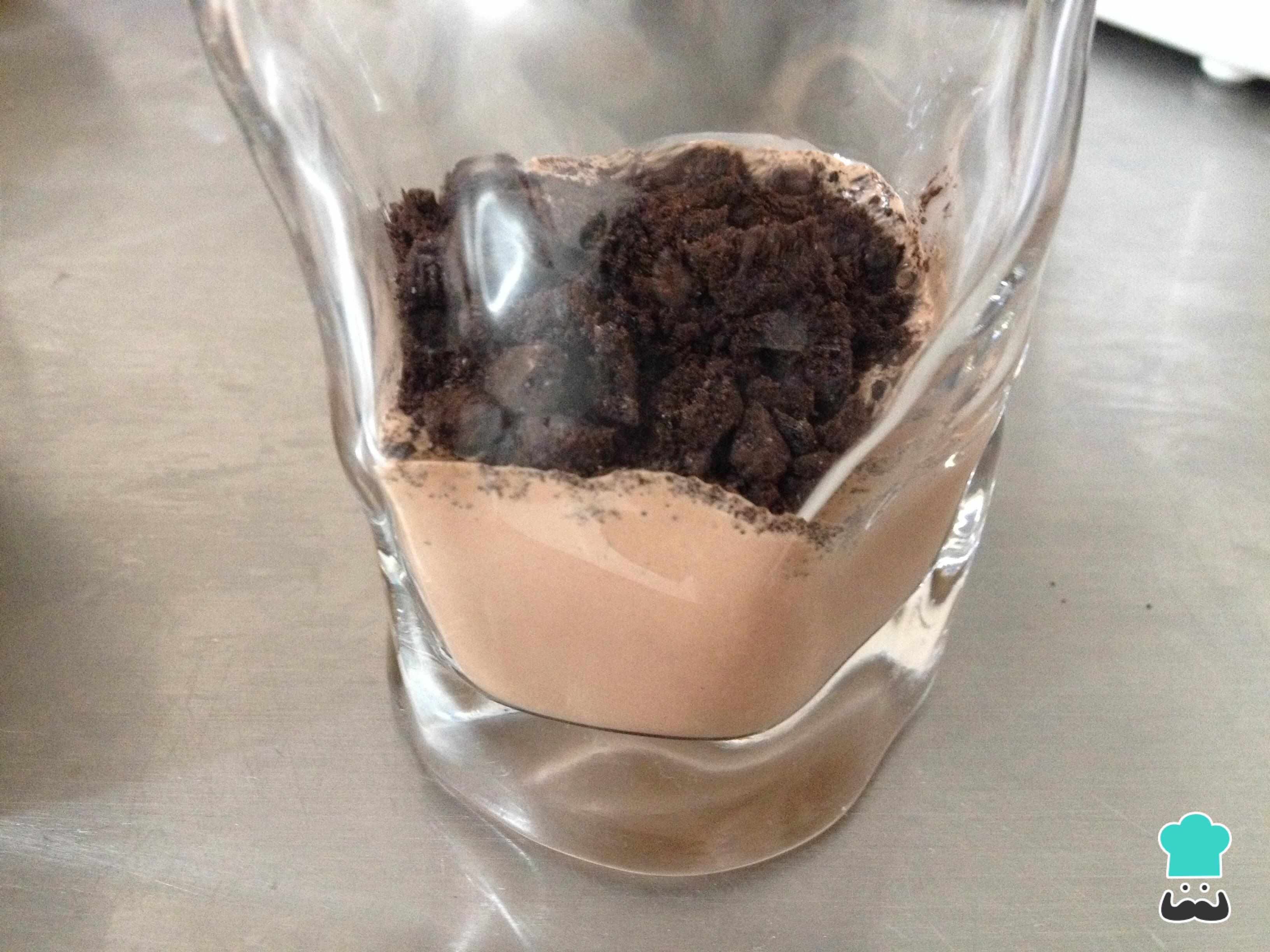 Distribua o creme de sorvete em vários copos de vidro transparentes, somente até metade, e cubra com um pouco dos biscoitos processados.