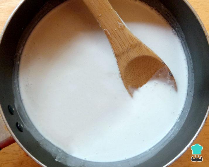 Coloque o leite numa panela e leve ao fogo médio. Quando começar a ferver adicione o açúcar enquanto mexe, para evitar a formação de grumos.