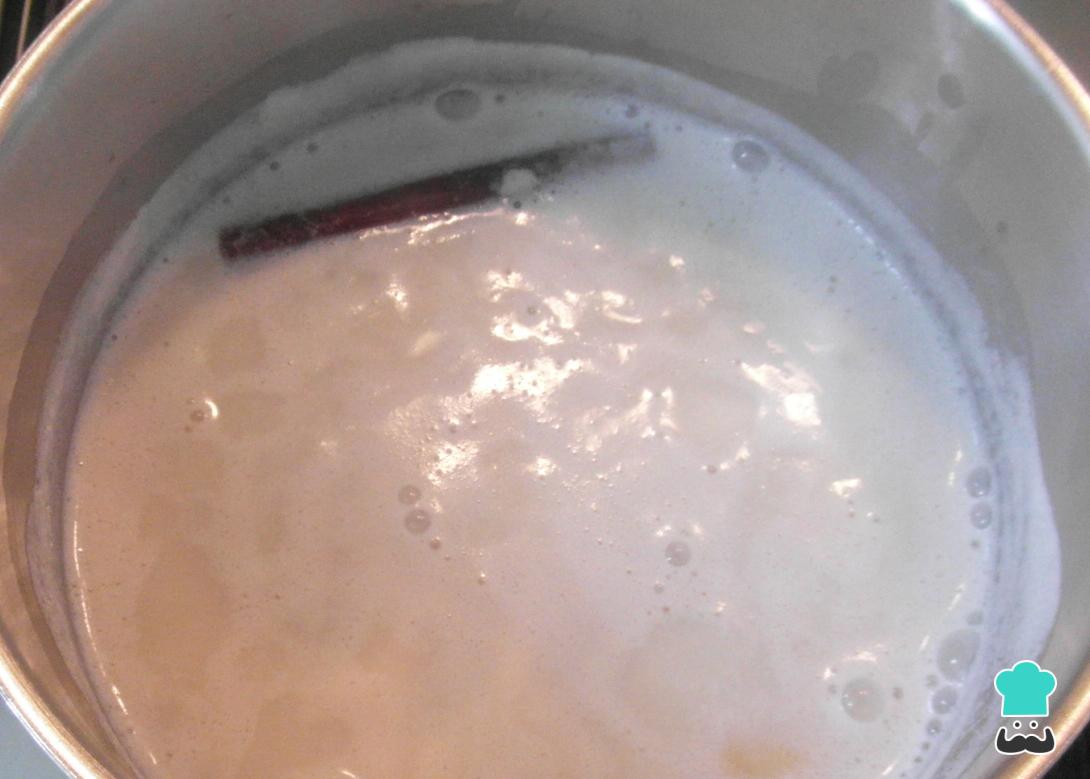 O primeiro passo dessa receita de doce de leite azedo é colocar em uma panela o leite, o açúcar, os ovos batidos e a canela. Leve ao fogo alto e fique mexendo até ferver.