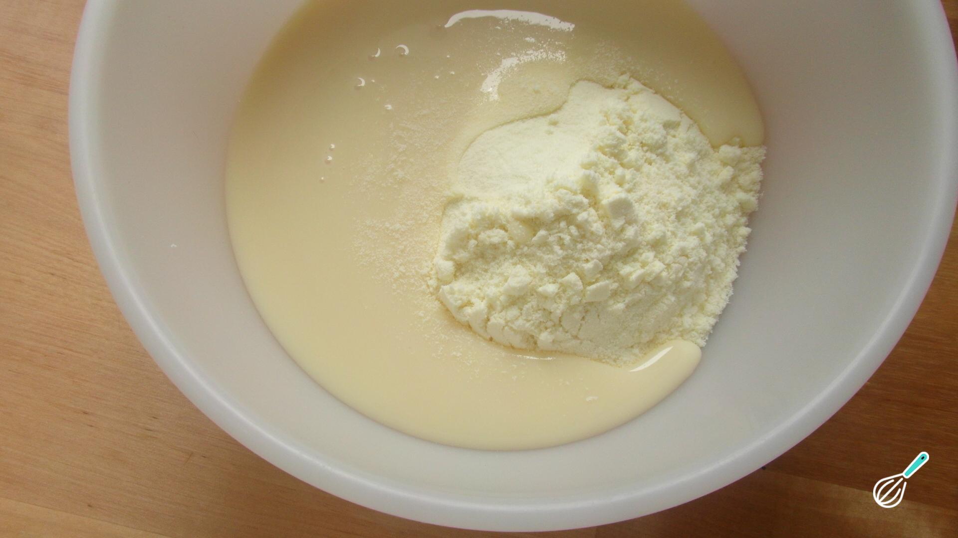 O primeiro passo para preparar estes bombons de leite condensado é misturar o leite condensado e o leite em pó com a ajuda de uma colher ou espátula.