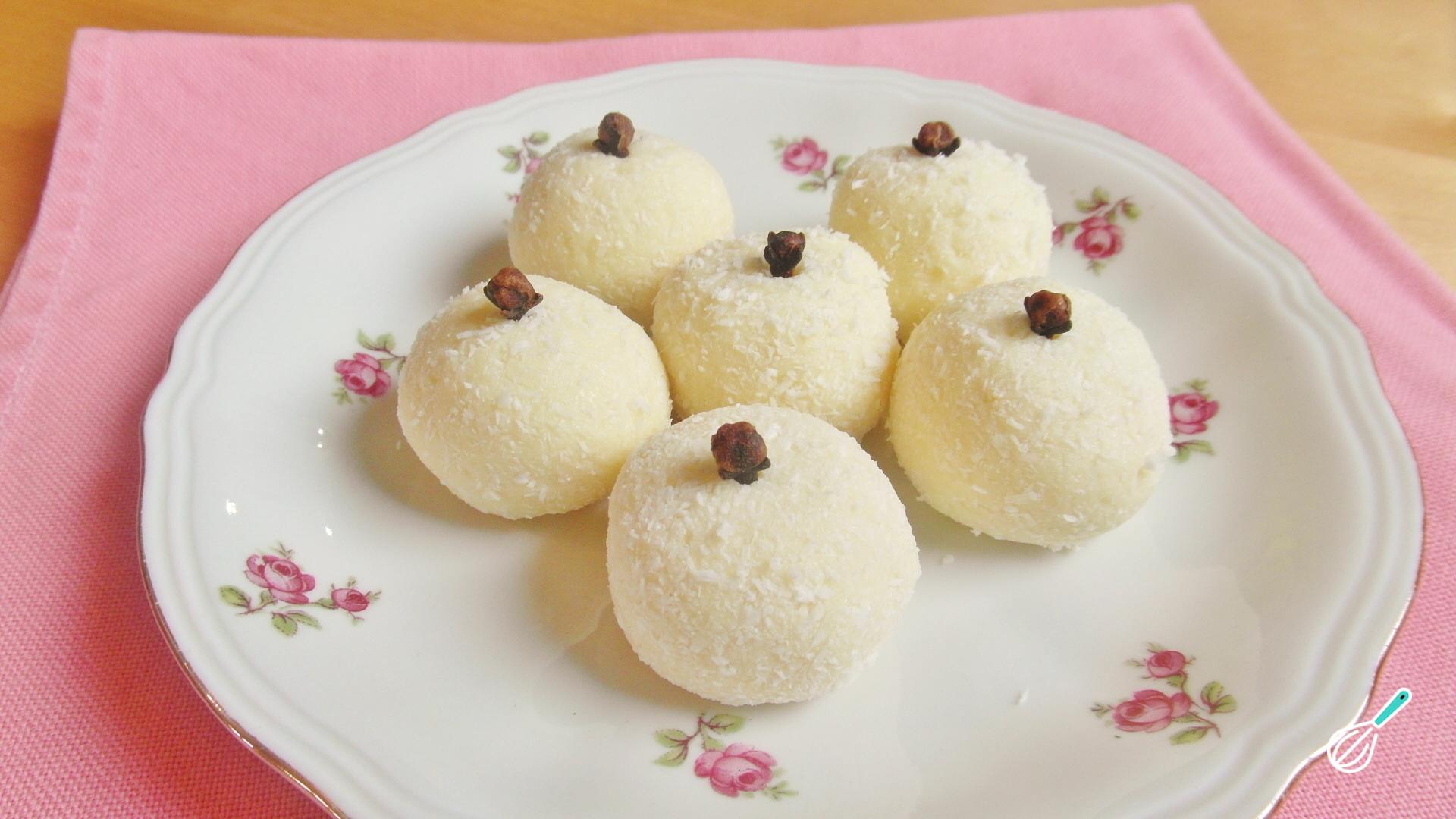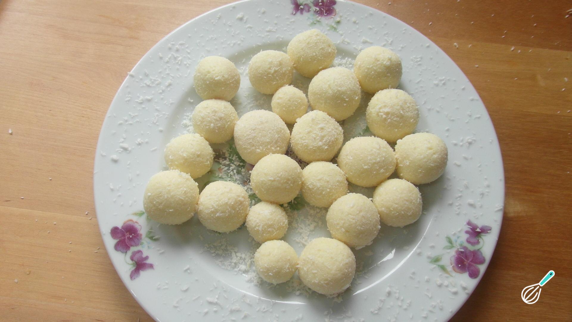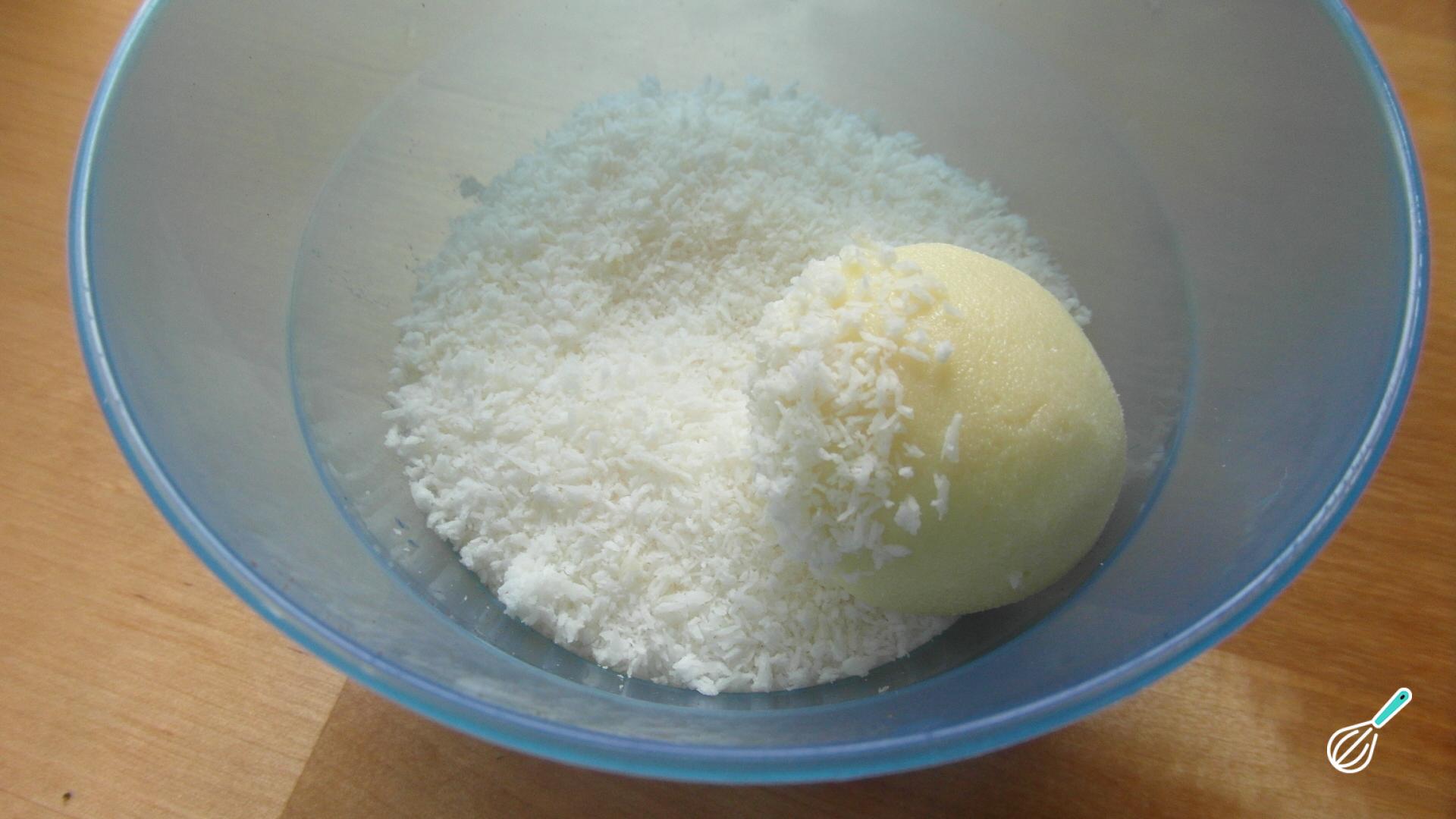 Retire pedaços da massa, modele em forma de bolinha e envolva com coco ralado.