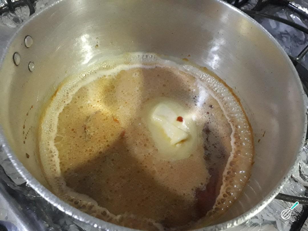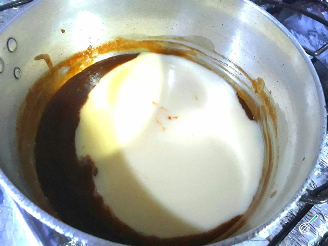 Depois, adicione a manteiga e o leite (cuidado para não espirrar) e misture bem até virar um caramelo e o açúcar queimado se dissolver por completo.