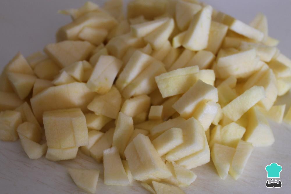Depois corte as maçãs pela metade e pique em pedaços, como na foto.