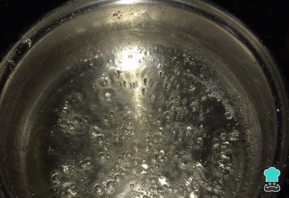 Para começar esta receita de ovos moles, coloque em uma panela a água e o açúcar. Leve ao fogo e deixe ferver até ficar um pouco grosso.
