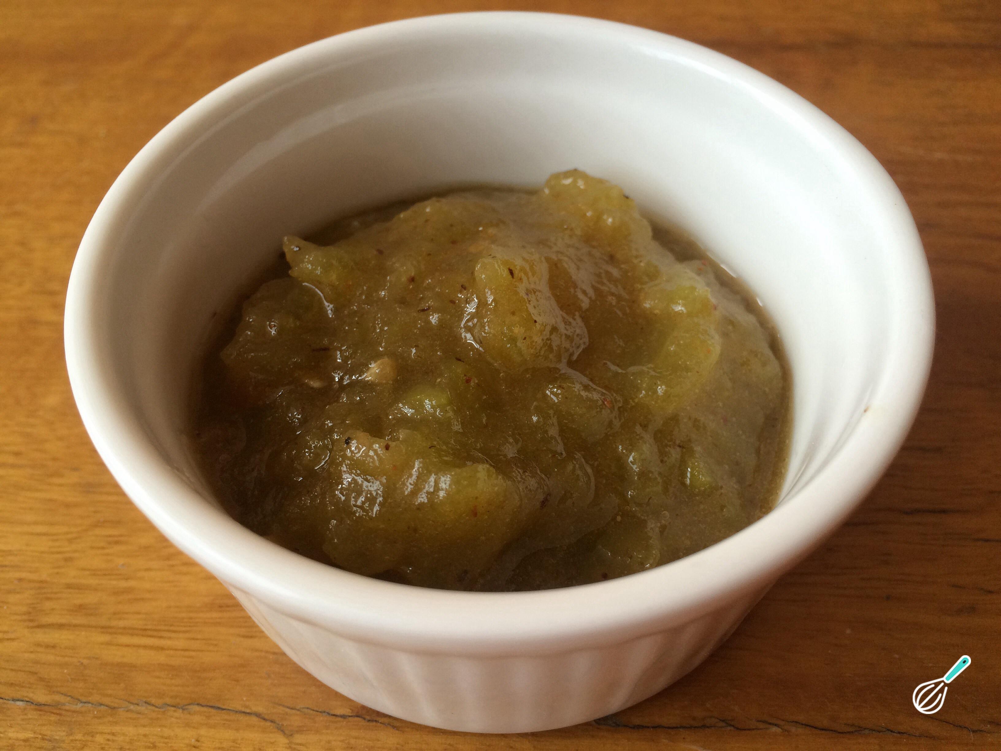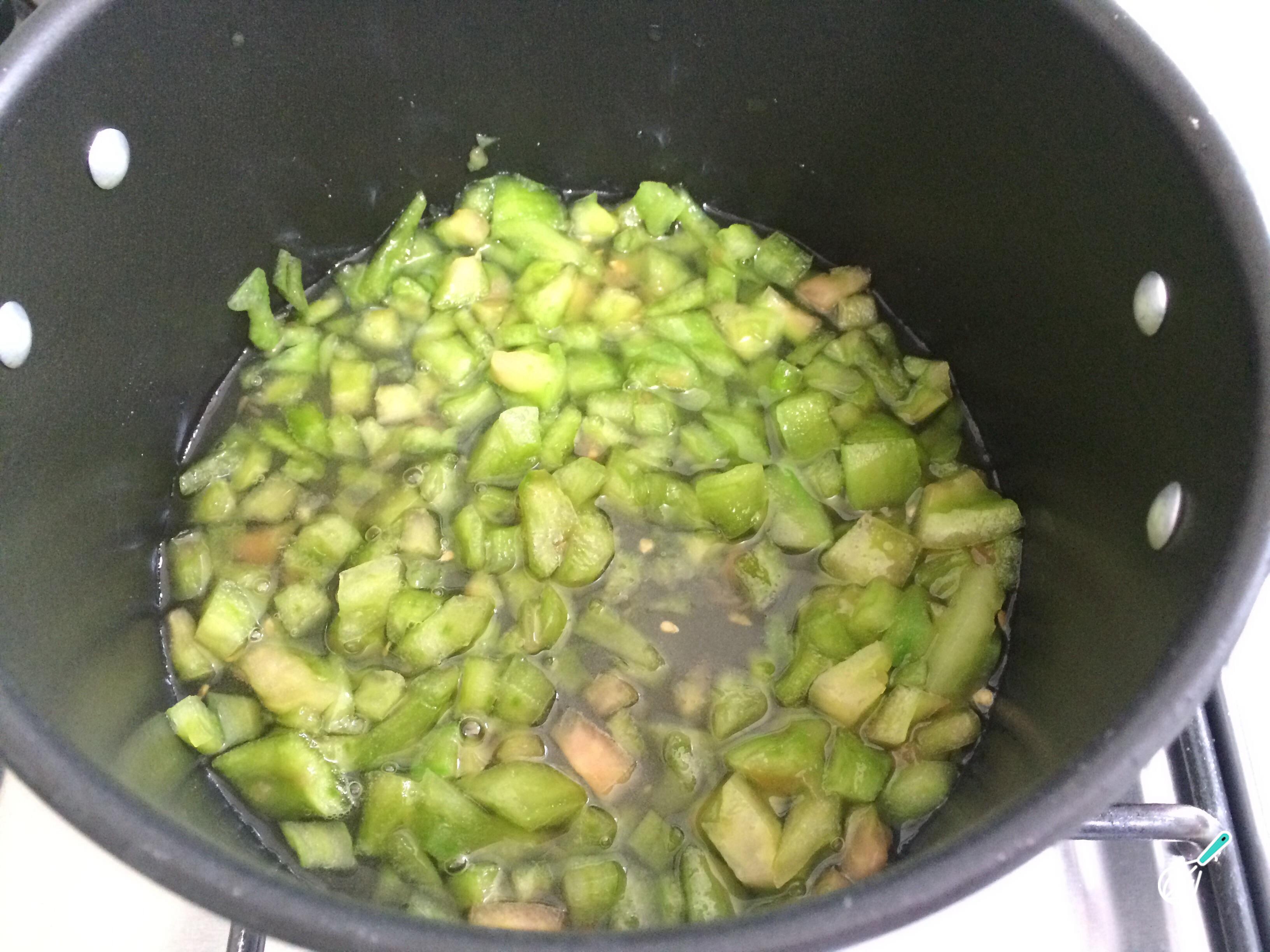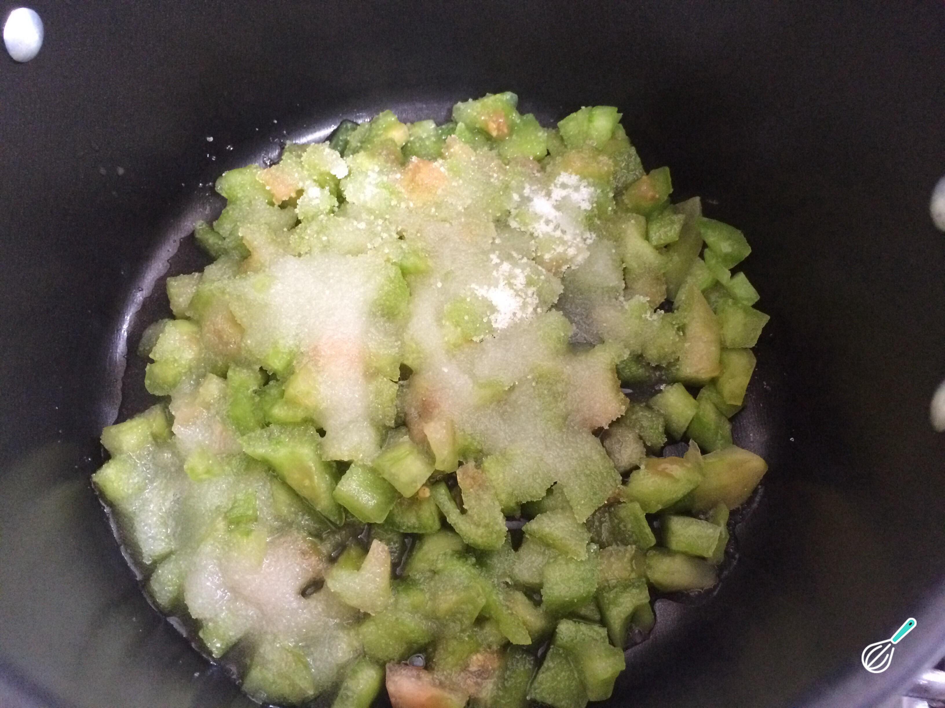 Coloque o tomate verde cortado em uma panela com o açúcar branco. Misture tudo e junte 100 ml de água. Deixe cozinhar em fogo baixo até ferver.