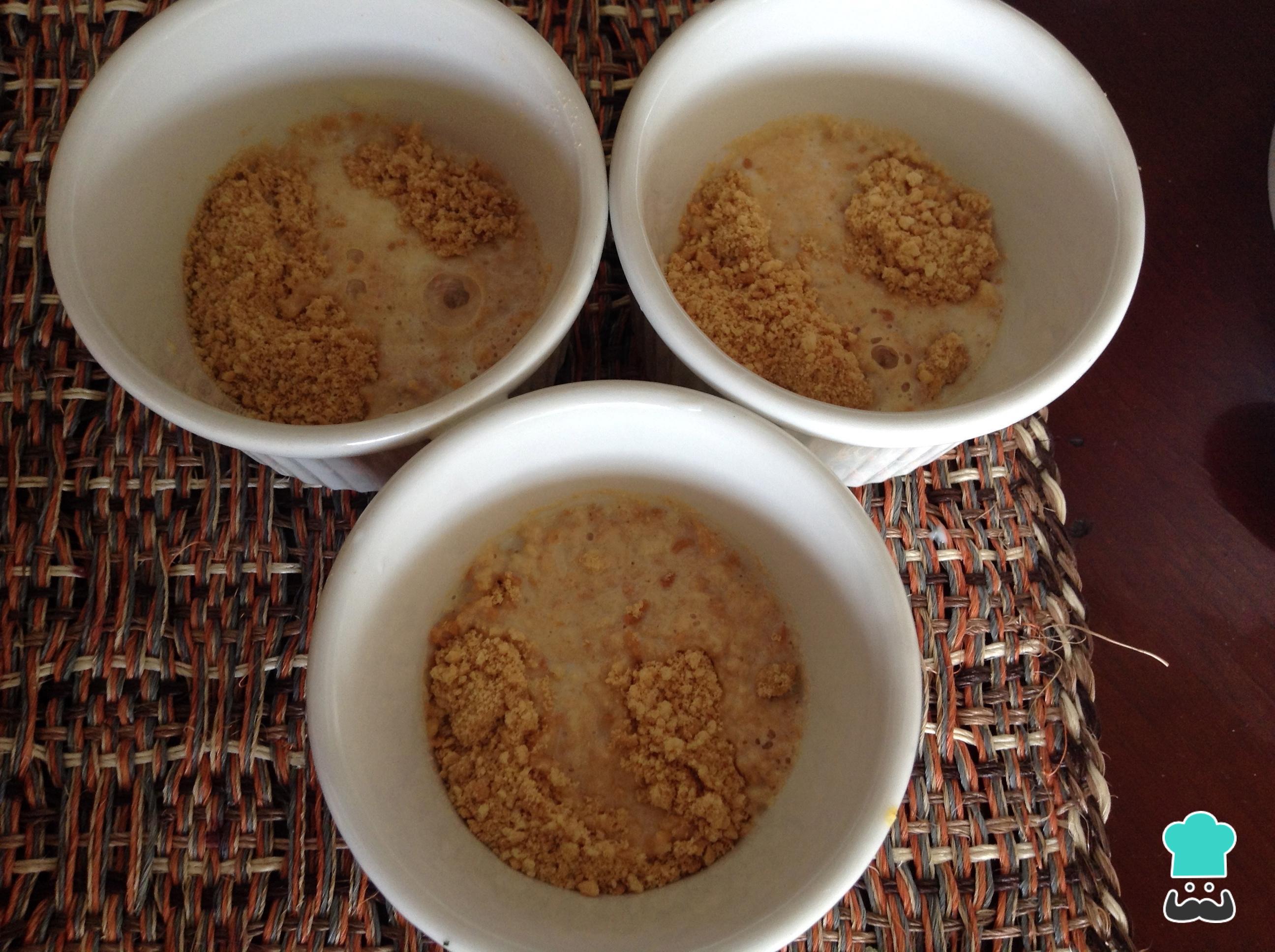 Coloque um pouco de biscoito em migalhas no fundo de cada molde individual e, sobre ele, uma colher de sopa da mistura de leites anterior. Cubra com mais biscoito e reserve na geladeira até que fique firme.