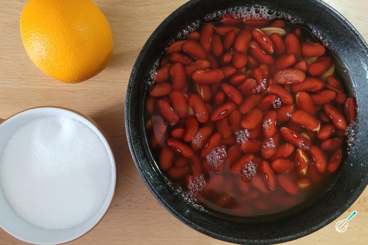 Normalmente a pasta anko é feita apenas com feijão cozido e açúcar, mas eu gosto de colocar um toque de suco de laranja, que acentua o sabor. Deixe o feijão de molho por pelo menos 8 horas (se quiser, troque a água) para eliminar fatores antinutricionais que dificultam a absorção de outros ingredientes (assim o feijão também cozinha mais rápido).