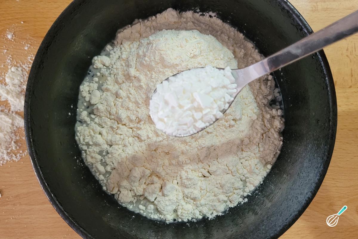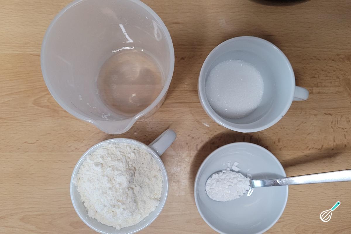 Em uma tigela, dissolva o açúcar na água. Adicione a farinha e o fermento em pó.