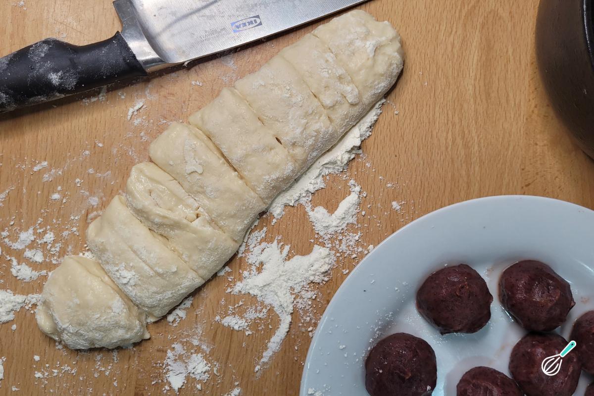 Retire a massa da geladeira, transfira para uma bancada bem enfarinhada e divida em partes iguais (aqui deram 8 partes).