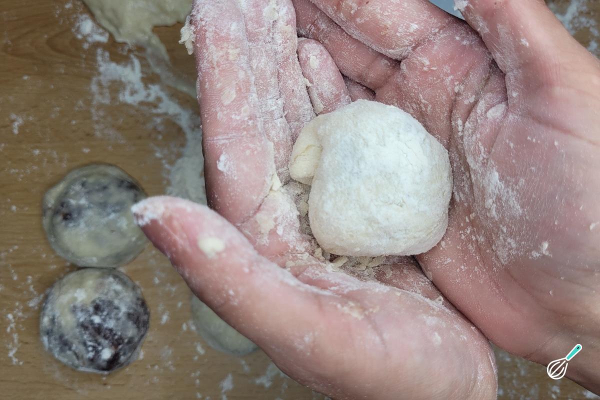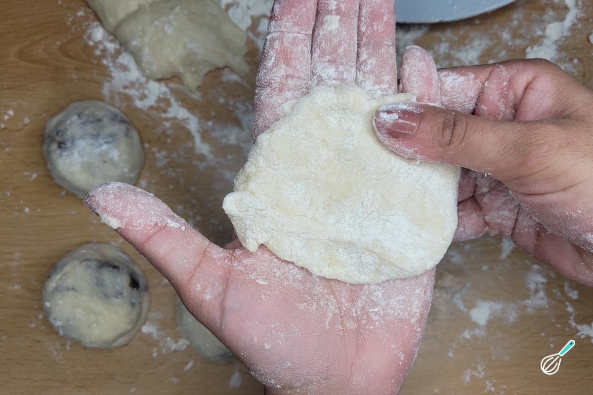 Com cada parte, faça uma bolinha e achate na palma da mão. Para facilitar, mantenha as mãos sempre bem enfarinhadas para conseguir trabalhar com a massa.
