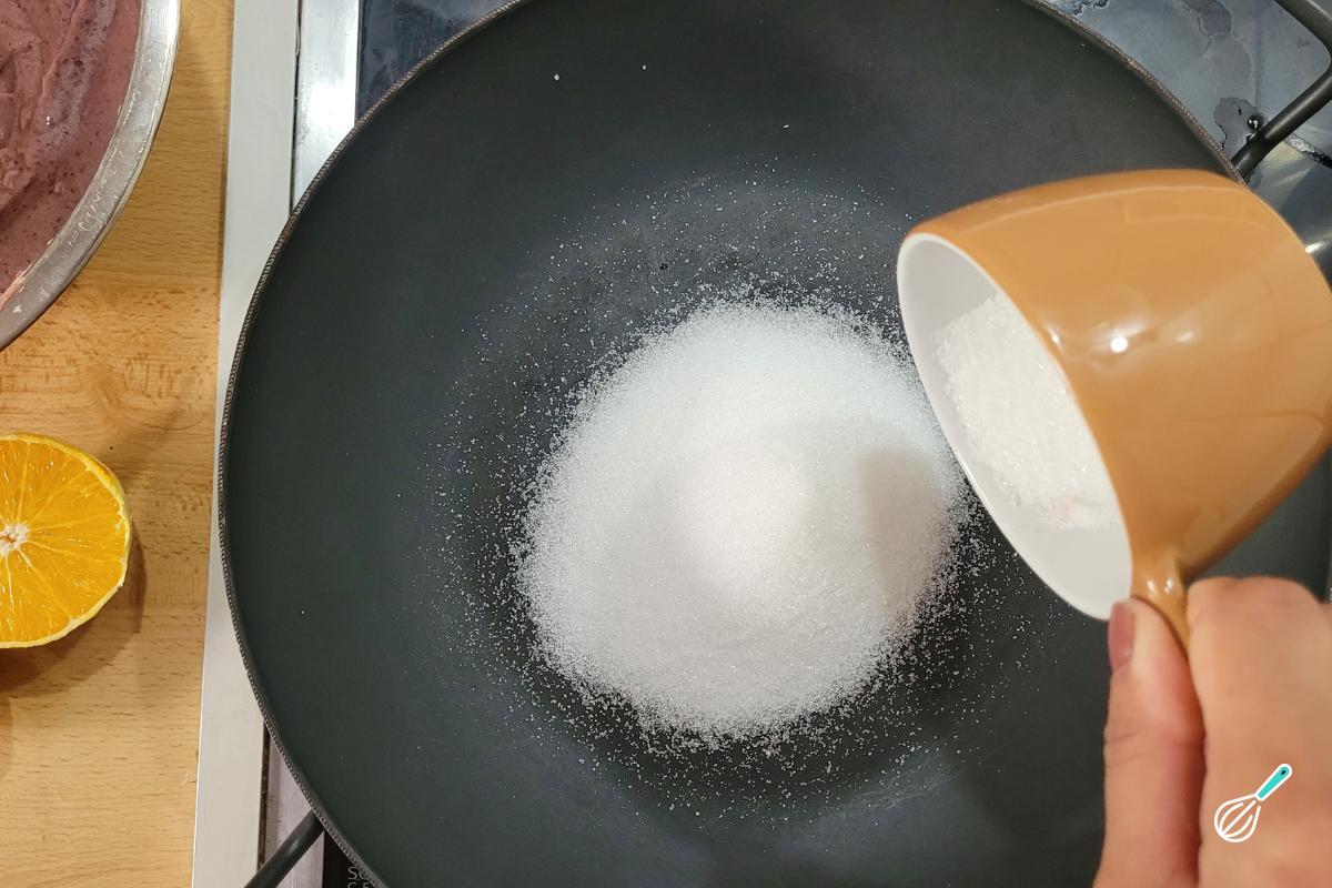 Em uma panela, coloque o açúcar e deixe derreter em fogo baixo até virar quase um caramelo, sem mexer.