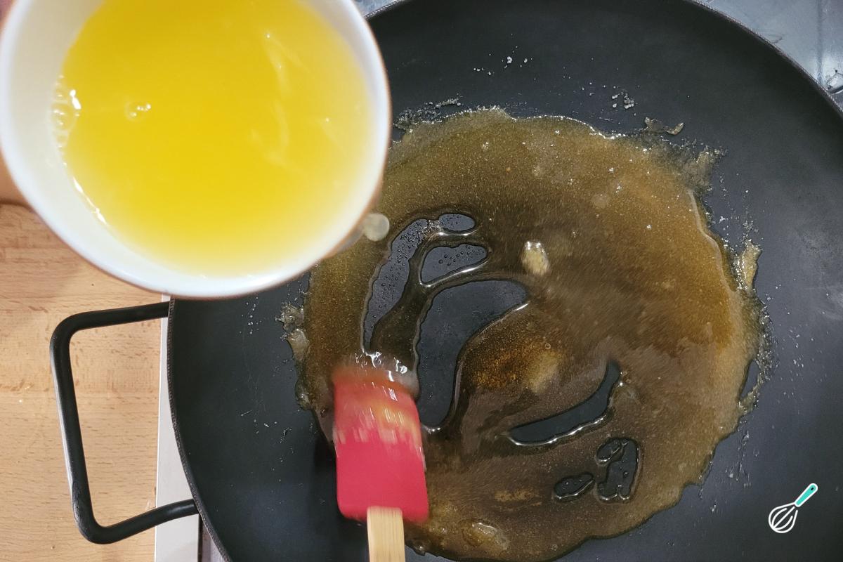 Abaixe o fogo, adicione o suco de laranja e mexa bem.