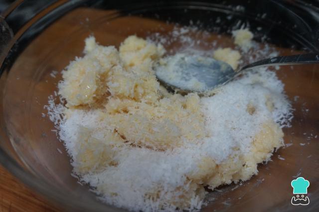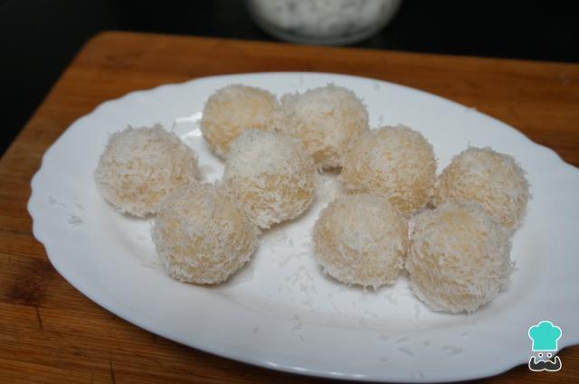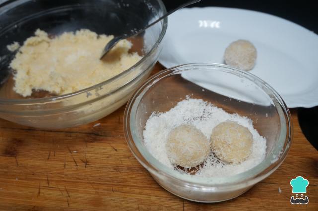 Depois do tempo de refrigeração, a massa deverá estar mais firme. Com suas mãos ou uma colher, pegue porções e modele bolinhas epasse-as no coco ralado.