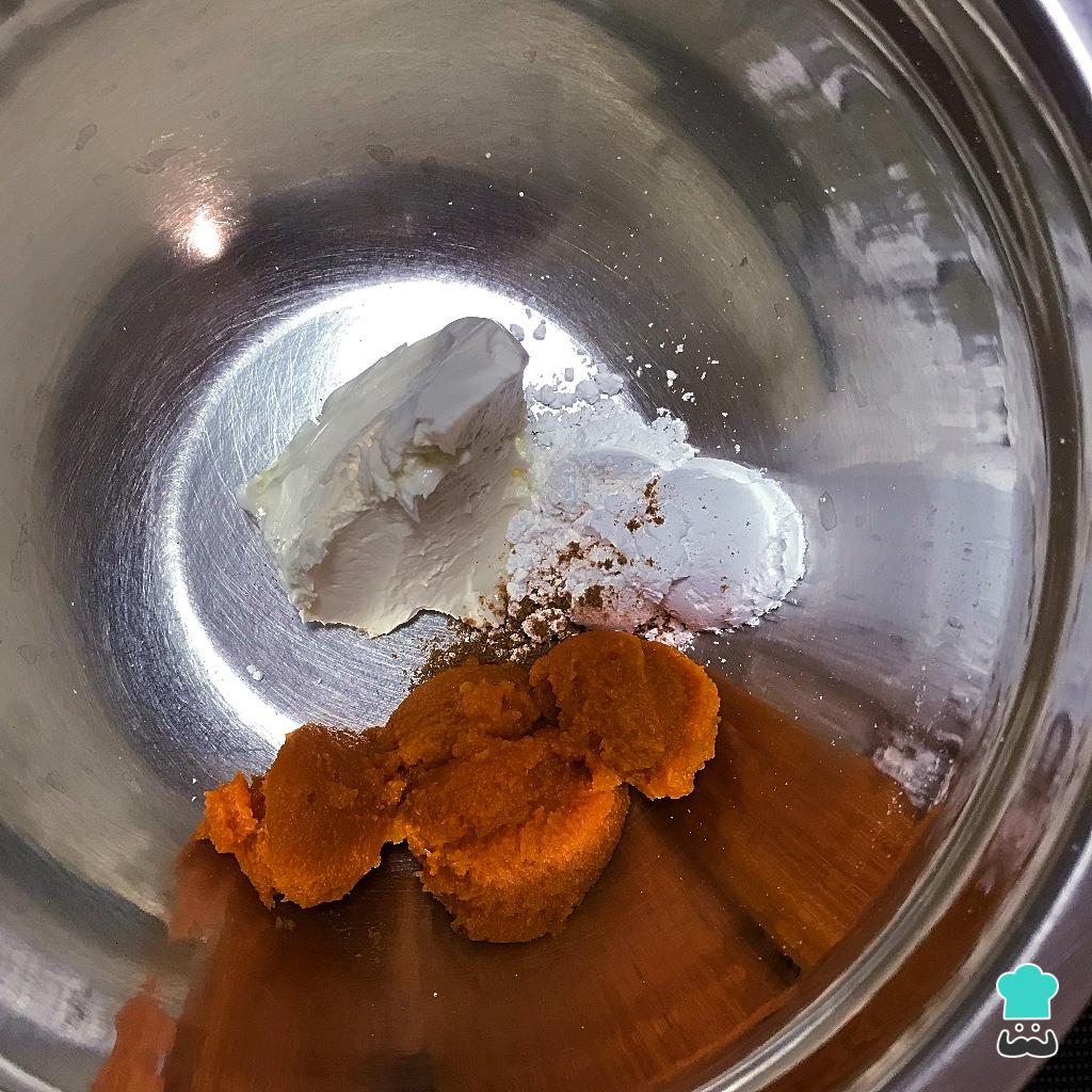 Comece seus bombons assustadores misturando o purê de abóbora com o cream cheese, o açúcar de confeiteiro e o pumpkim spice.