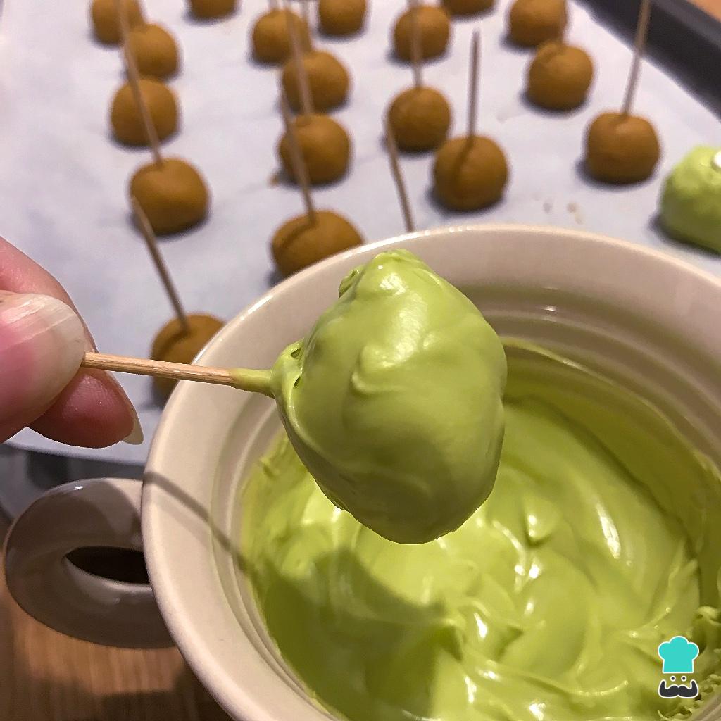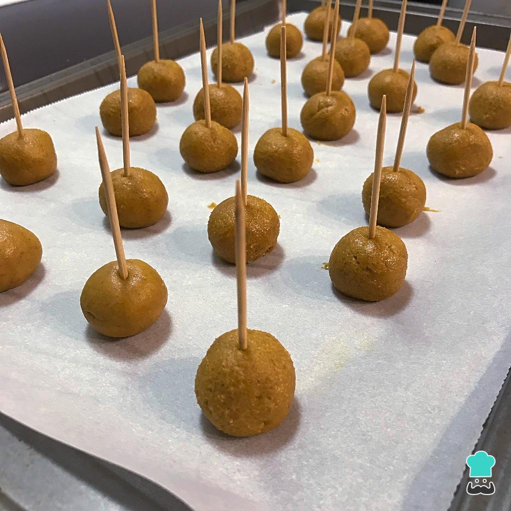 Forre uma forma com papel manteiga. Faça bolinhas do mesmo tamanho, coloque na forma e fure com palitos de dente (ajuda a cobrir com o chocolate depois). Leve ao freezer novamente por pelo menos 1 hora.