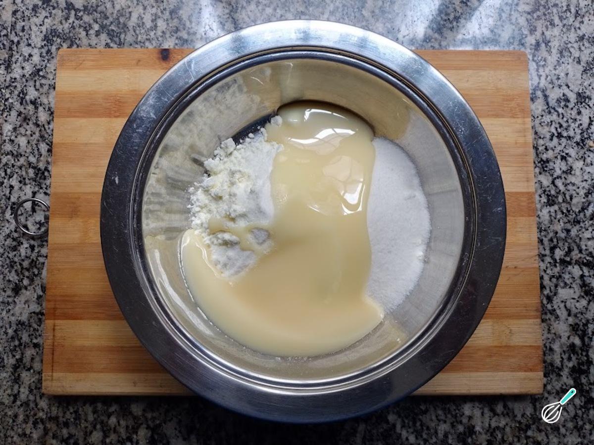4. Por último, adicione o leite condensado e comece a mexer aos poucos, com uma colher.