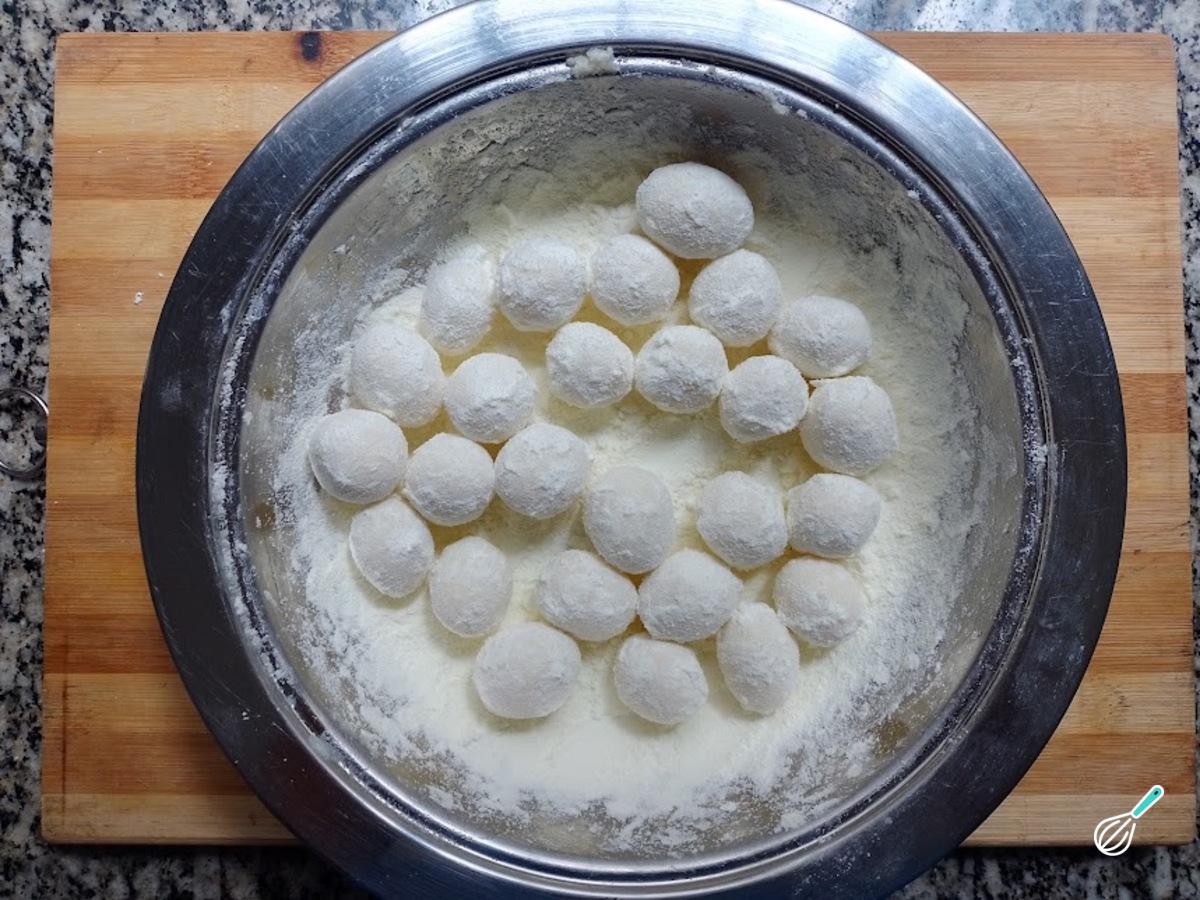 8. Depois de enrolar os docinhos, cubra cada bolinha no leite em pó, garantindo uma cobertura bem uniforme.