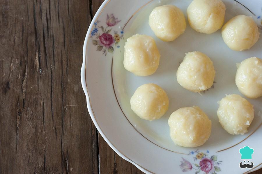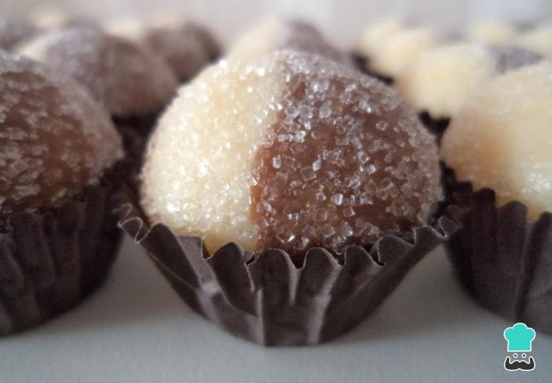 Quando ambas as massas estiverem prontas, unte as mãos e modele bolinhas pequenas. Depois una as bolinhas brancas com as bolinhas escuras, e enrole no açúcar.