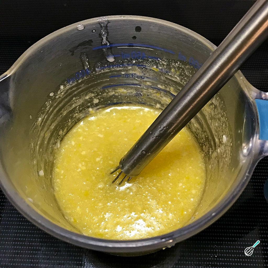 Numa vasilha misture os restantes ingredientes: o ovo com o xarope de bordo, o leite e o óleo de coco derretido.