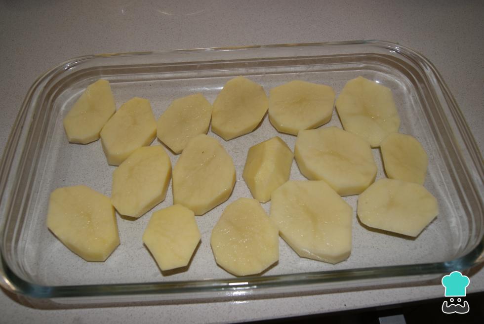 O primeiro passo desta receita de dourada no forno é descascar as batatas e cortar em rodelas, com cerca de 2 cm de espessura. Coloque em uma assadeira.