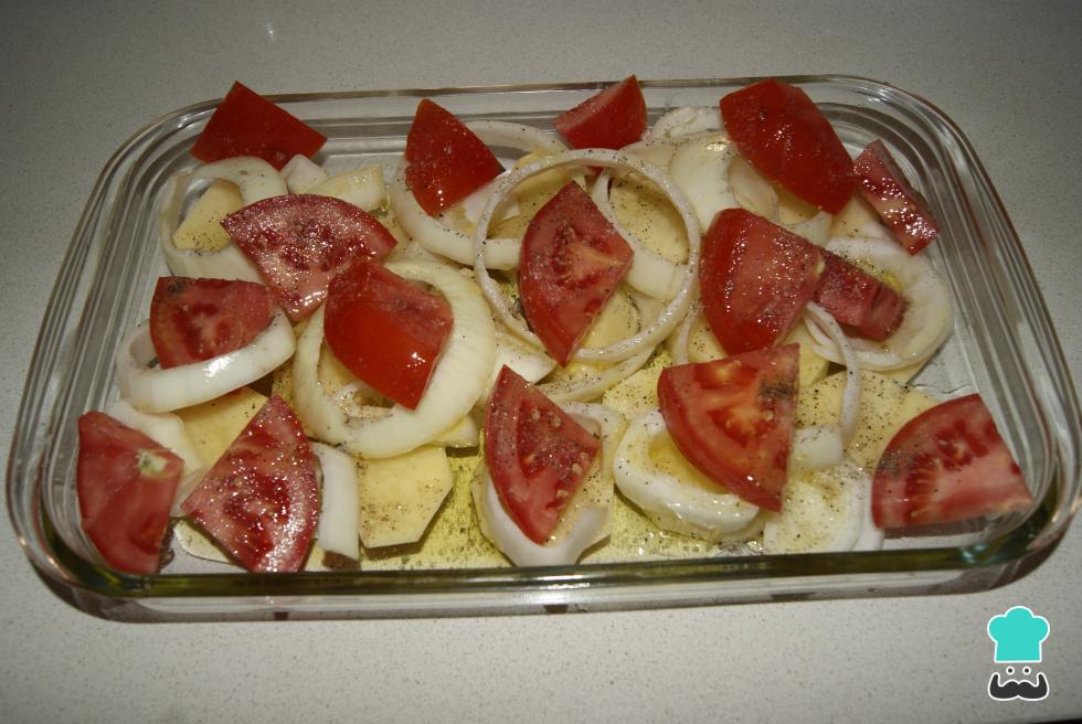 Em seguida descasque a cebola, corte em rodelas e coloque sobre as batatas. Estamos preparando uma cama de legumes para a dourada.