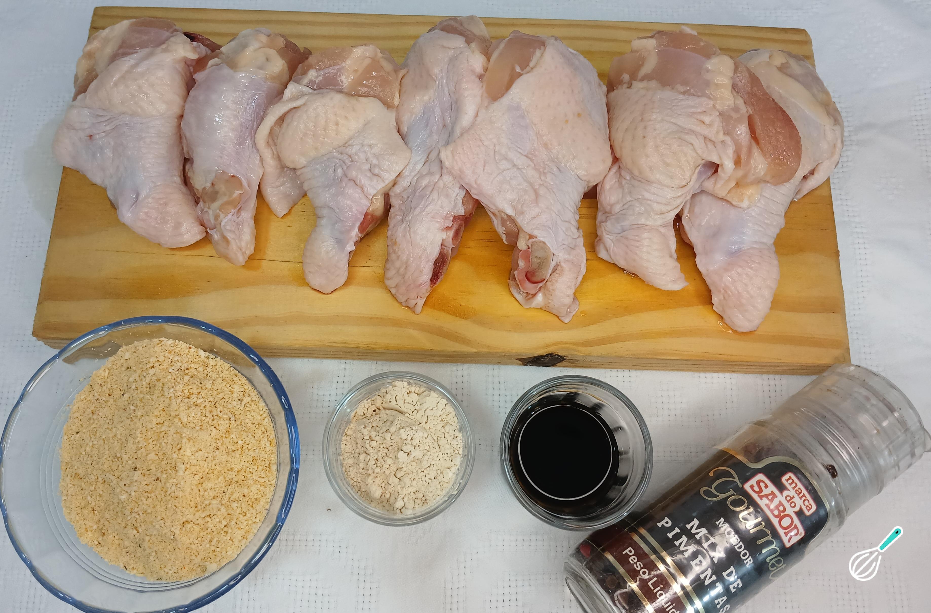 Comece separando os ingredientes para o preparo do drumet no forno. Separe os drumets, separe os temperos de sua preferência. Separe o molho inglês e a mostarda. Separe a farofa pronta. É importante separar os ingredientes para que não corra o risco de esquecer algum. Deixe tudo separado e ao alcance.