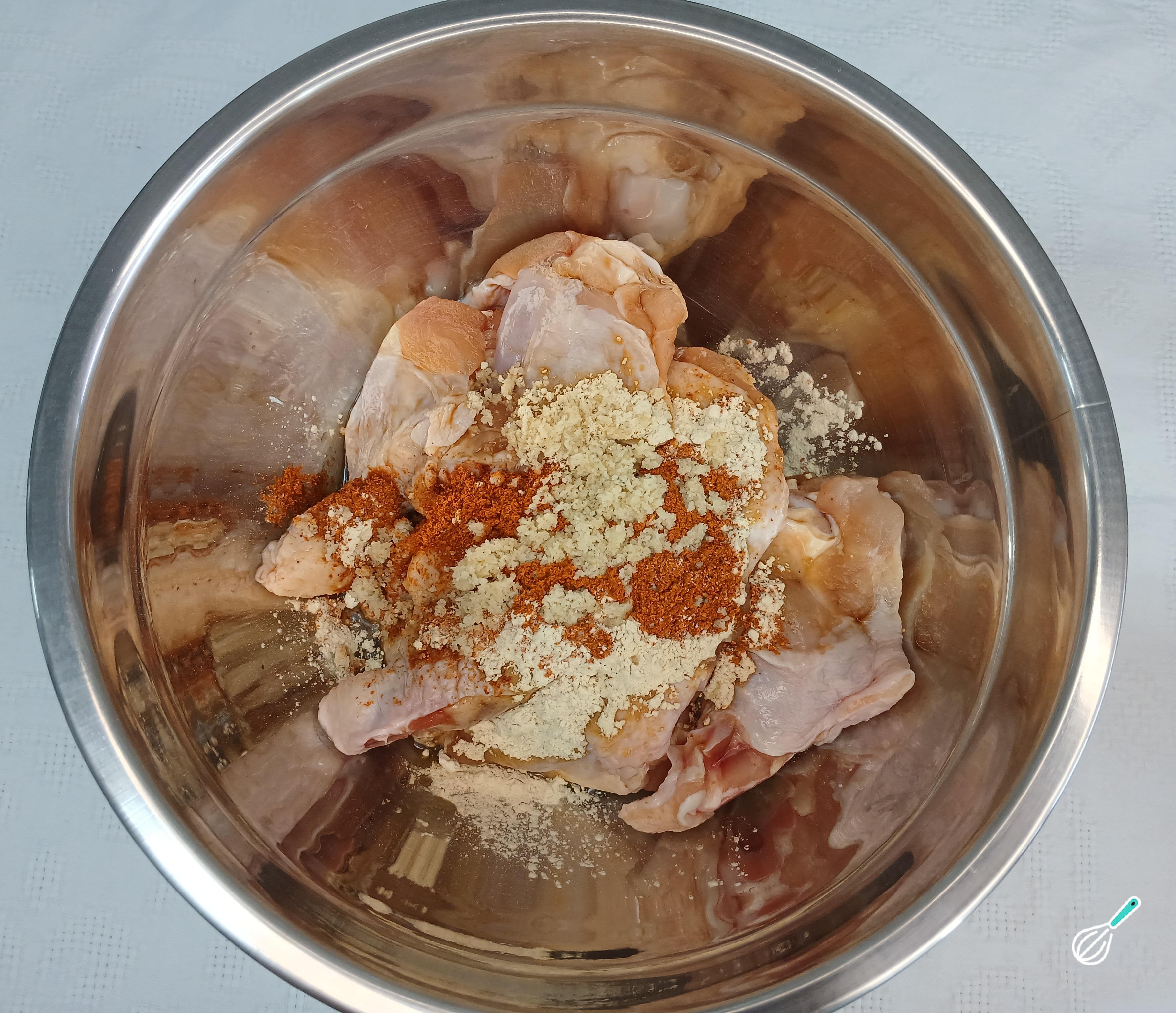 Feito isso, em um bowl coloque os drumets e os temperos: acrescente o alho em pó, a cebola em pó, a páprica picante defumada, o gengibre em pó, o molho inglês, a mostarda,a pimenta e o sal. Misture tudo muito bem usando as mãos para integrar bem os temperos.