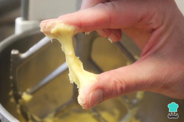 O passo seguinte da massa para bomba é colocar a massa numa tigela (de preferência o bowl da batedeira elétrica) e, enquanto mistura, acrescentar os ovos pouco a pouco, até a massa se tornar lisa, elástica e não muito mole, tal como na fotografia. Pode não ser necessário adicionar todo o ovo, por isso vá com calma e observe o ponto da massa.